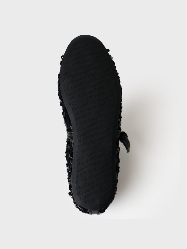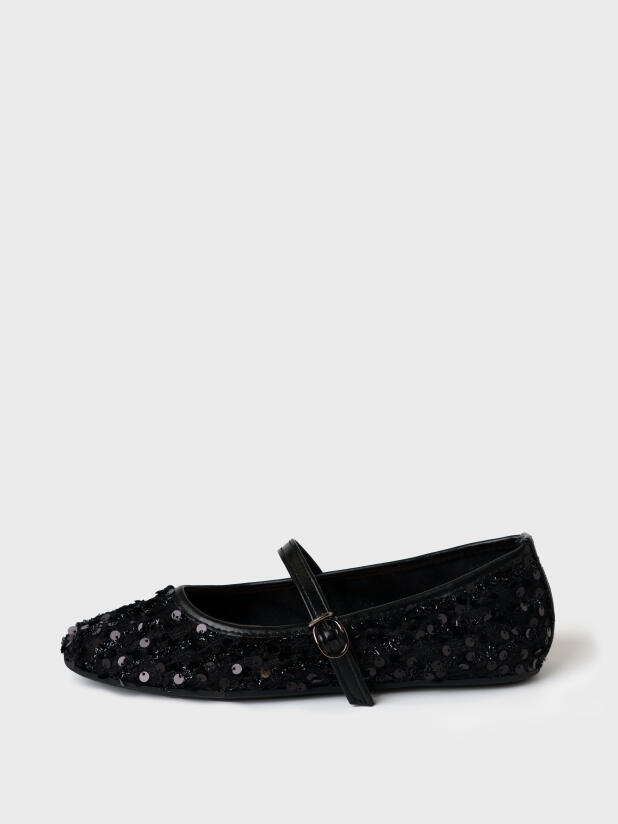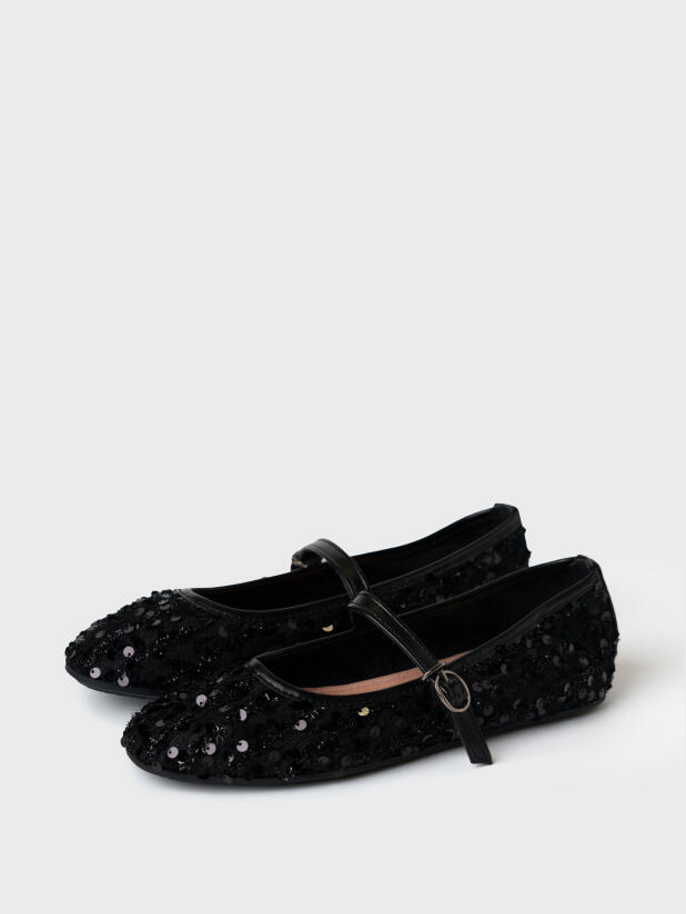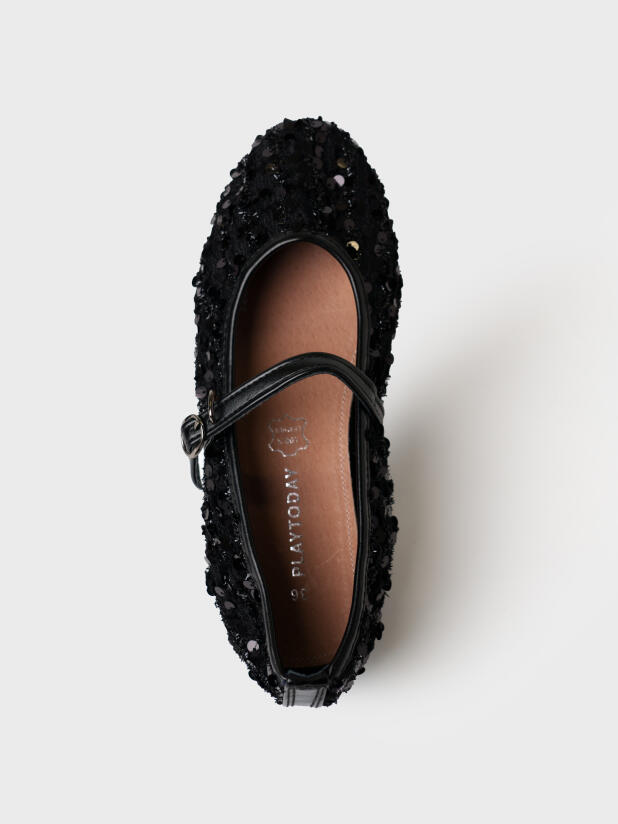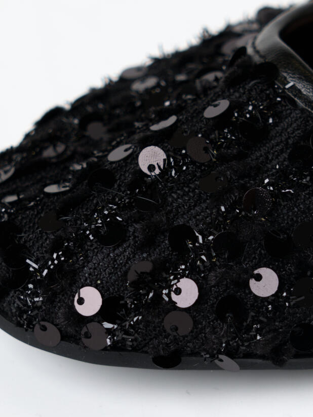 Нарядные балетки с пайетками украсят как повседневной образ, так и будут прекрасным дополнением к нарядному платью. Туфли выполнены из дышащего текстиля без подкладки. Стелька - натуральная ламинированная свиная кожа. Балетки имеют чересподъемный ремешок. Пряжку не надо расстёгивать, она удобно закрывается на крючок. Туфли имеют очень легкую и гибкую резиновую подошву.