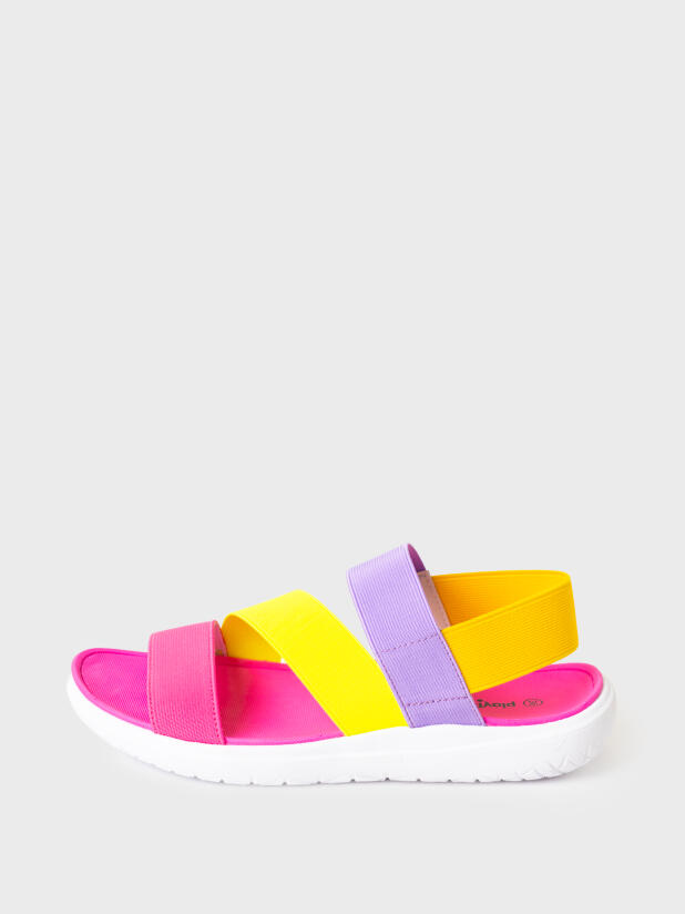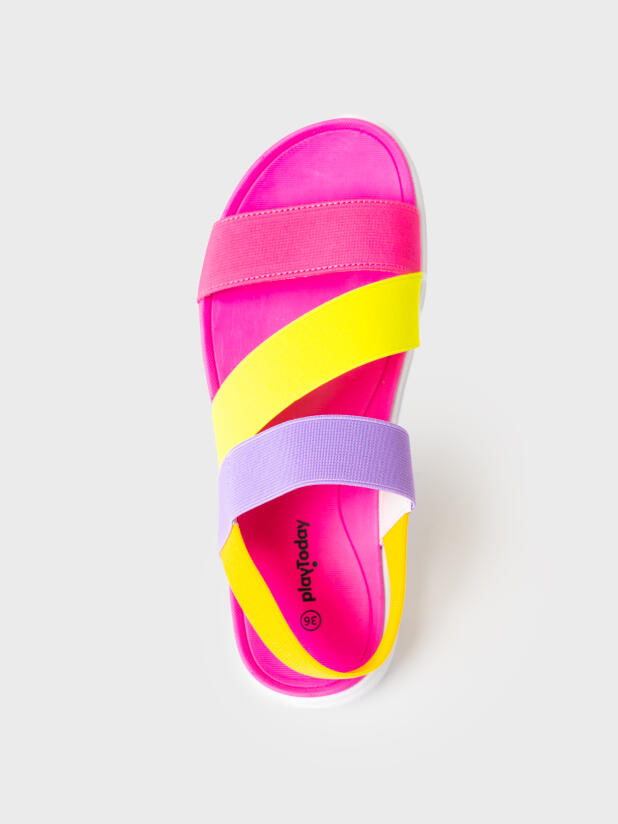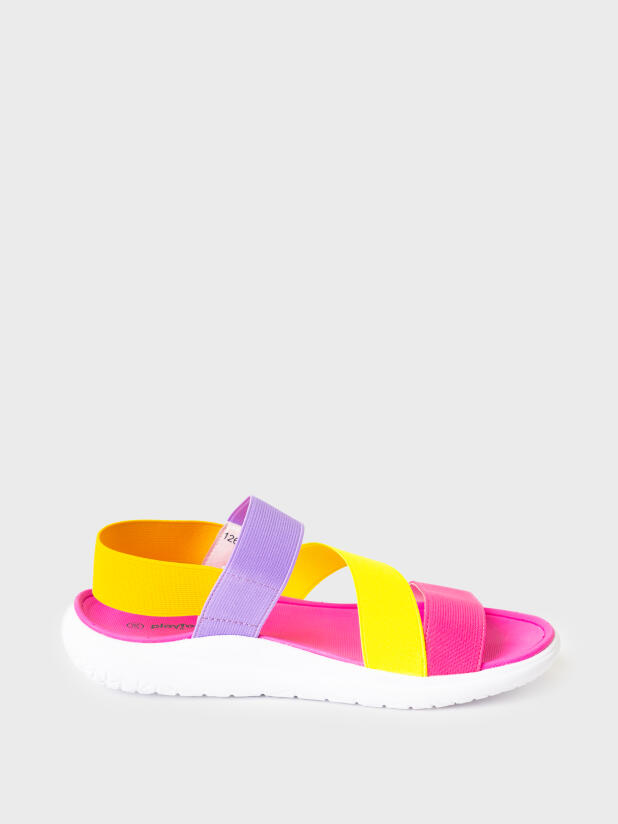 Спортивные легкие сандалии для девочки. Босоножки имеют очень удобную конструкцию за счет использования эластичных резинок, которые надежно фиксируют обувь на стопе. Эта модель подойдет на любой подъем и обхват ноги. Подкладка выполнена из натуральной кожи. Стельку из ЭВА легко мыть. Облегченная подошва из ЭВА очень гибкая. Форма подошвы выполнена с учетом анатомических особенностей стопы, поэтому модель очень удобная