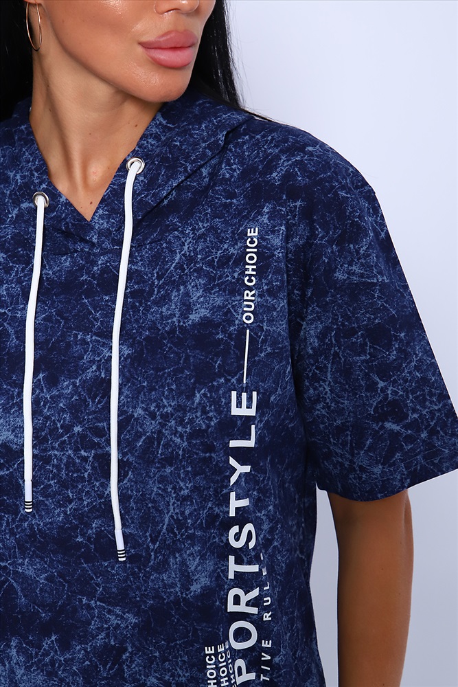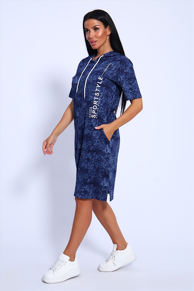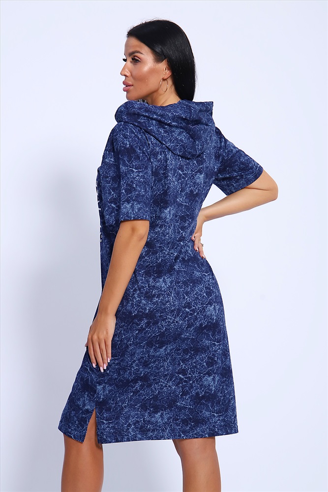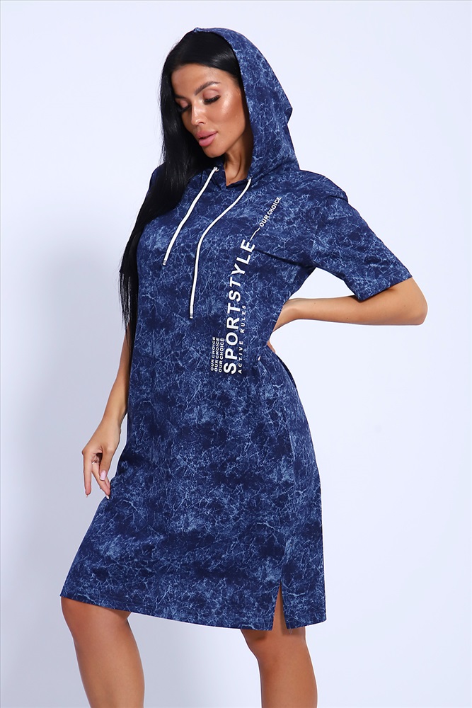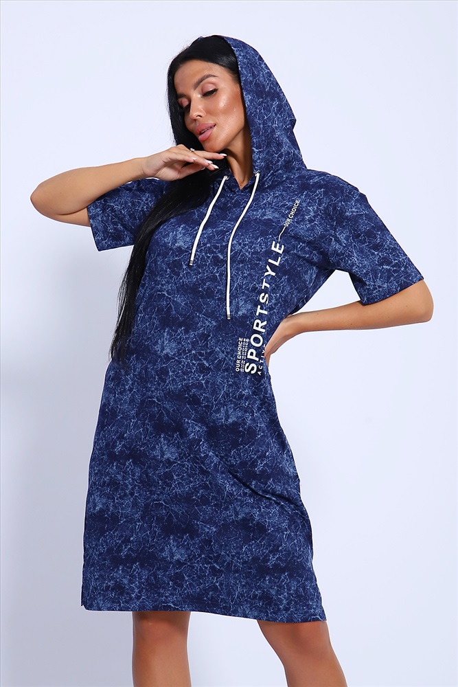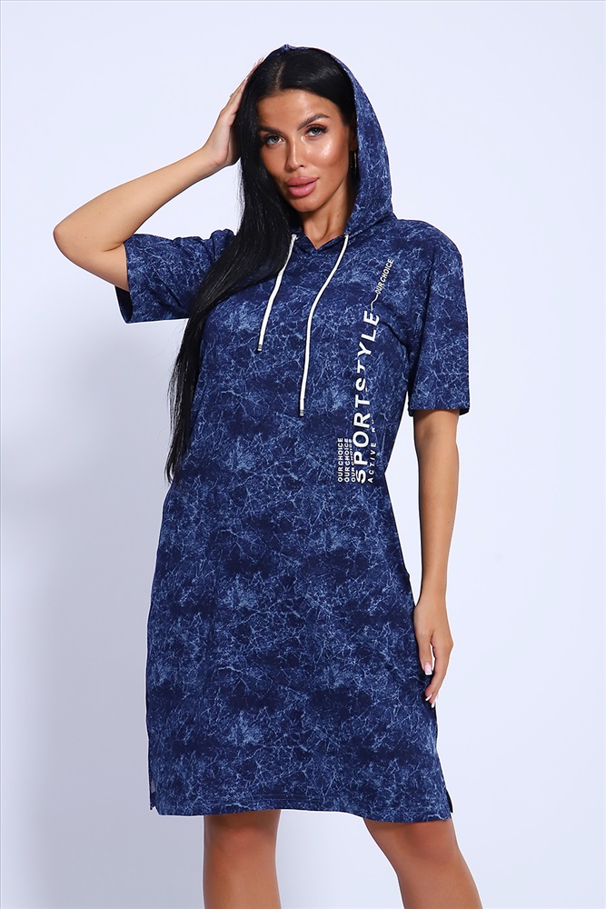 Застежка: без застежки Женская туника из легкого трикотажного материала тонкого хлопка - кулирки. Свободная, спортивная, с капюшоном, объем которого регулируется атласной лентой контрастного цвета. Тунику вполне можно использовать как летний вечерний костюм, как повседневный домашний наряд или как легкое праздничное или офисное платье. Благодаря свободному крою, туника отлично подойдет полным и пышным женщинам, беременным девушкам и кормящим мамам. Рисунок ткани имитирует вареную джинсовку, актуален всегда и придает изделию особый шик. Карманы спрятаны в боковых швах для вашего удобства.