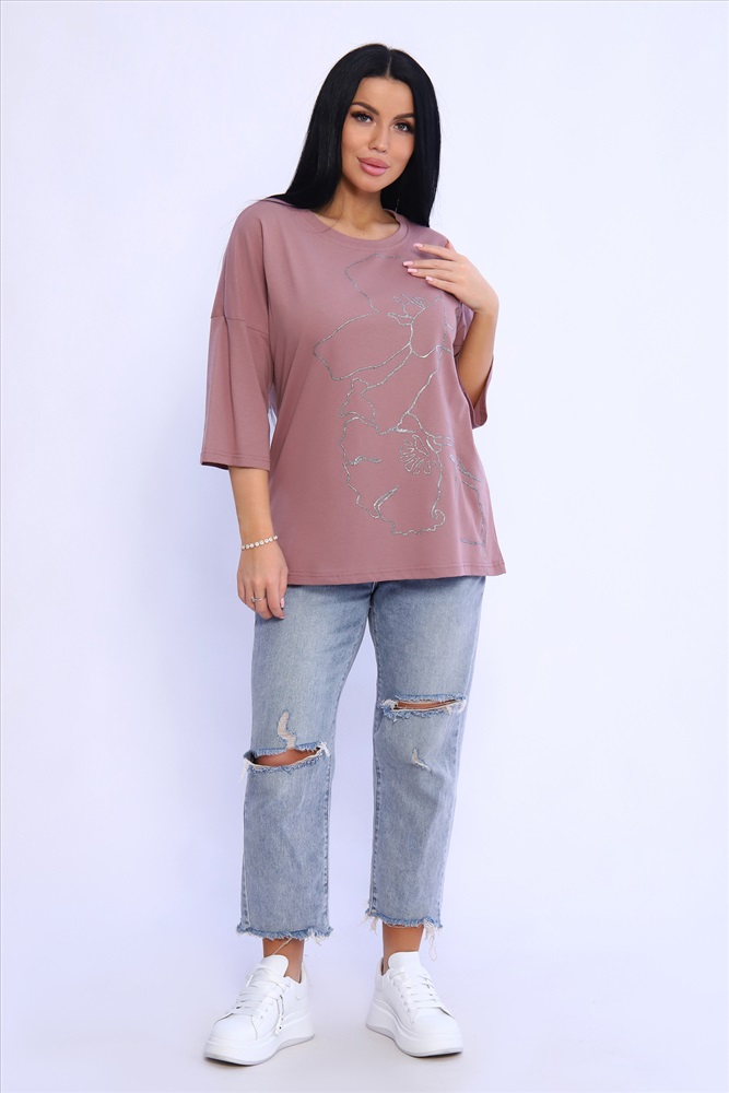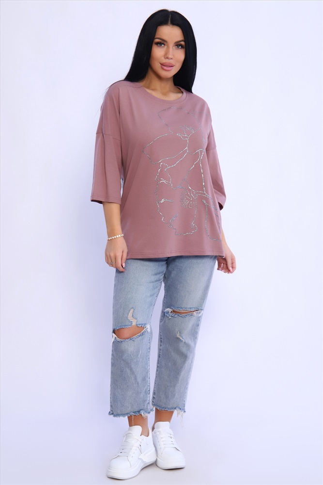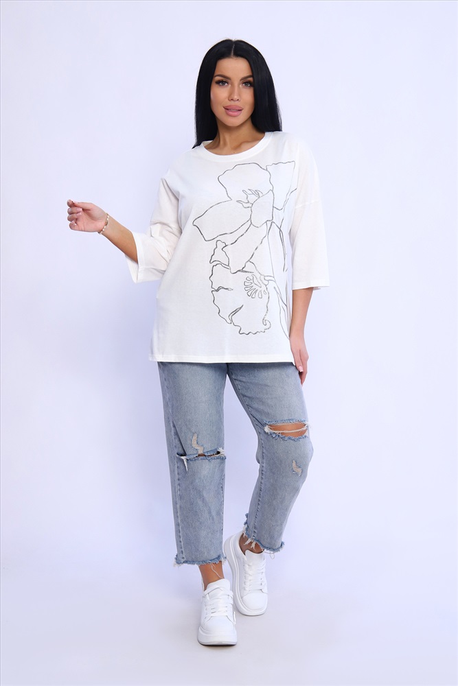 Туника из натурального хлопка прекрасный вариант для повседневного образа. Будет комфортна и как базовый вариант к классическим брючкам, так и к стилю спортшик. Принт в виде большого цветка лилии с использованием глиттера и техники объёмной печати украшает модель, придавая ей изысканный вид. Обработка деталей вкруговую с закрепкой, рукав длиной 3/4, горловина втачная из основной ткани. Большие размеры!