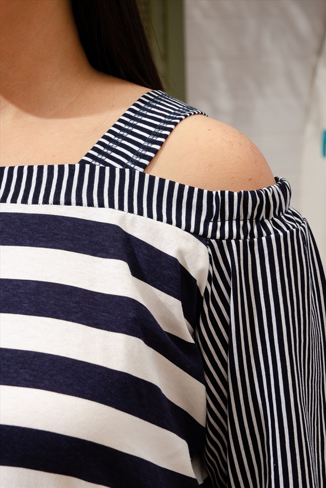 Туника с открытыми плечами на широких бретелях, расширенная к низу, в боковых швах разрезы, рукав ниже локтя, по низу рукава сборка, манжета с завязками. Сочетание в тунике крупной и мелкой полосы придает изделию особую неповторимость, морской стиль особенно актуален для лета.
