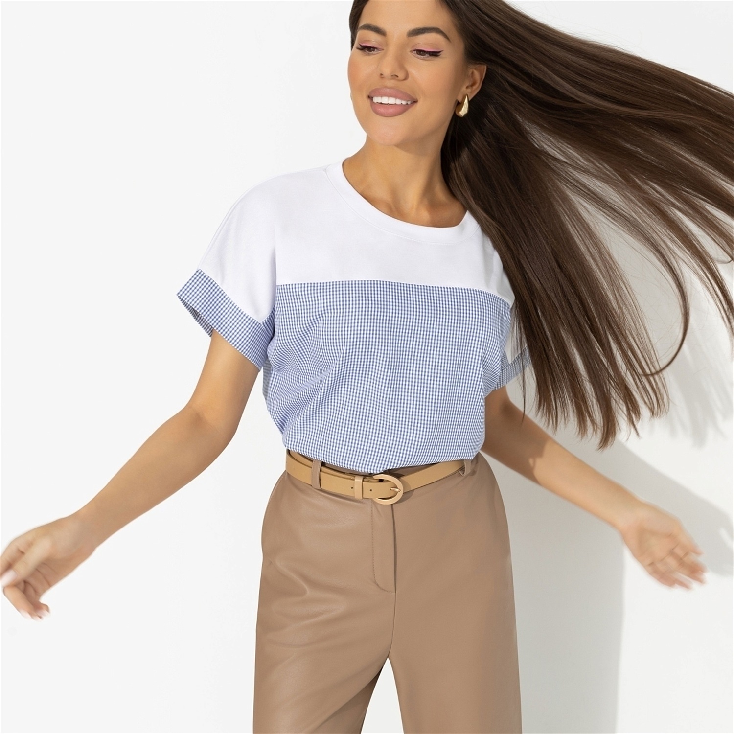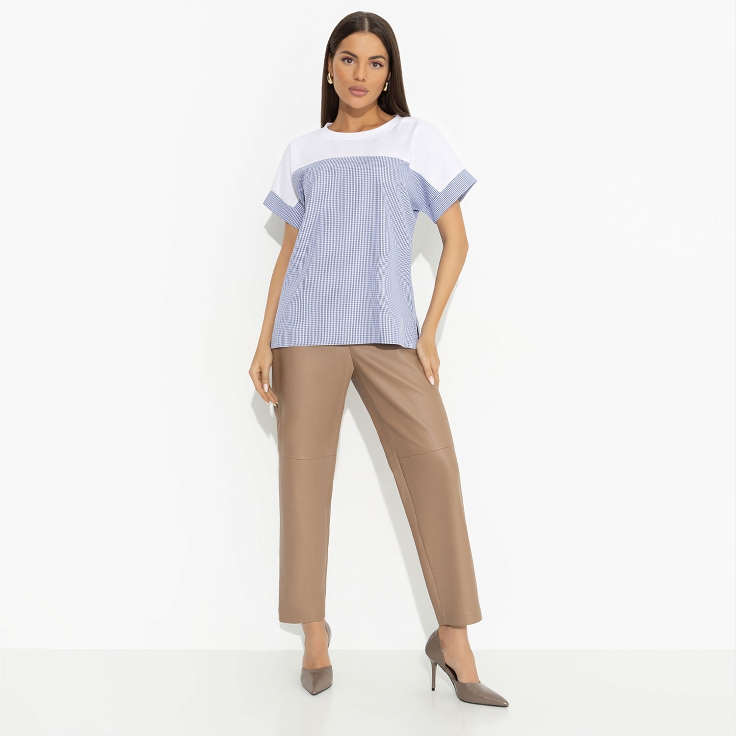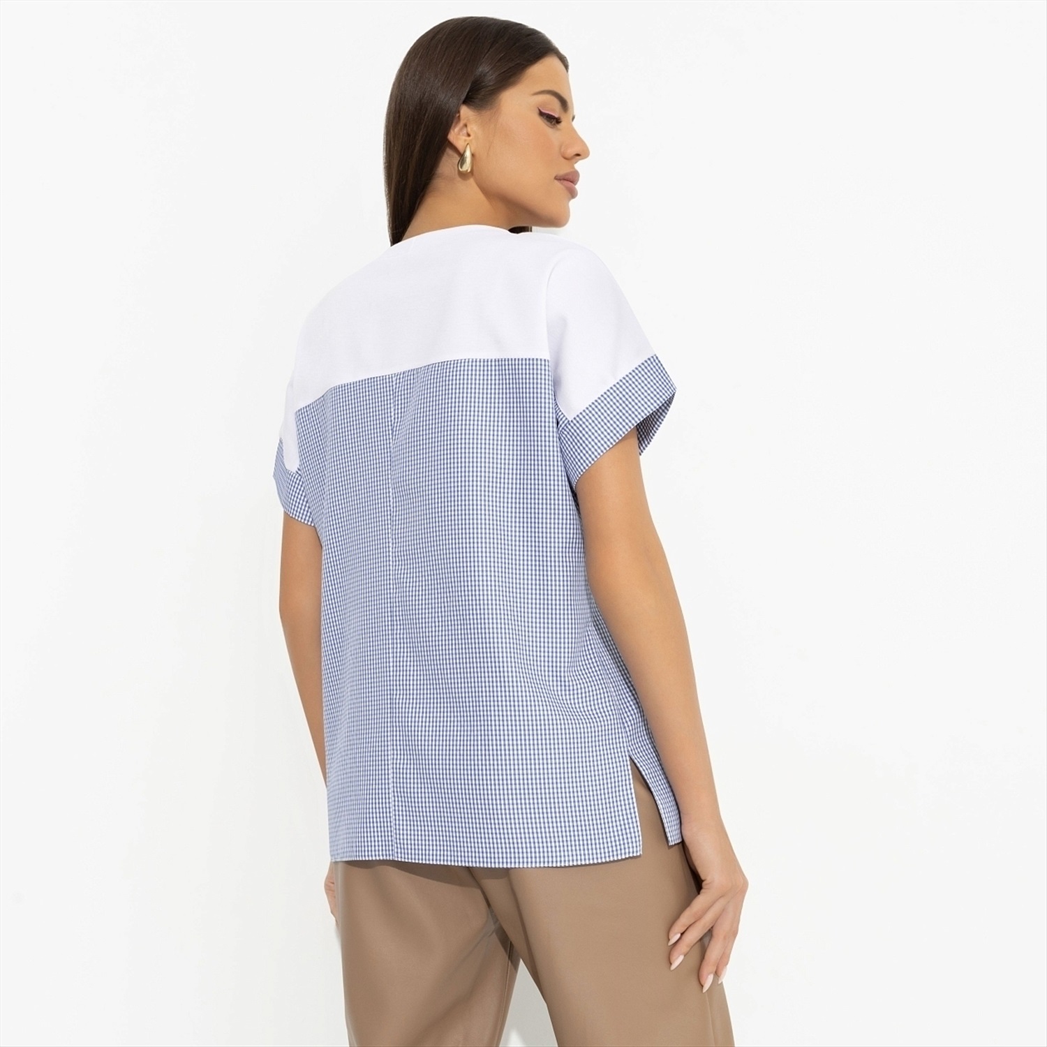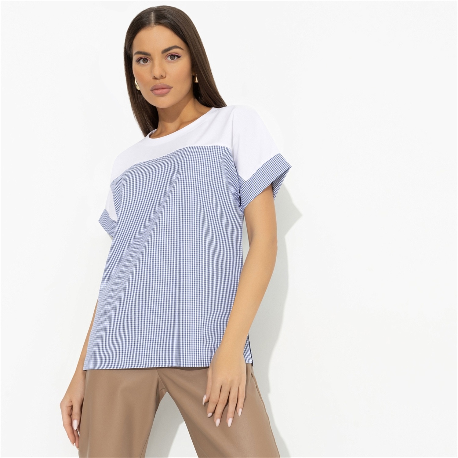 ТН ВЭД: 6206400000; Состав: Трикотаж «милано» (65% п/э, 30% вискоза, 5% стрейч); Плотность ткани: Средняя; Тип ткани: Трикотаж; Вид застежки: Нет; Дополнительный цвет ткани: Белый; Карманы: Нет; Основной цвет ткани: Синий; Отрезная талия: Нет; Подклад: Нет; Резинка по талии: Нет; Рисунок/раппорт: Нет, все изделия идентичны; Сезон: Круглогодичный; Силуэт: Свободный; Стиль: Повседневный