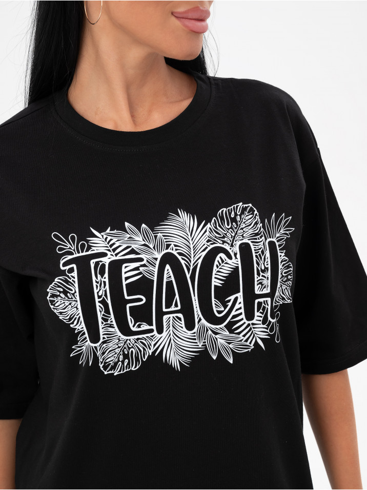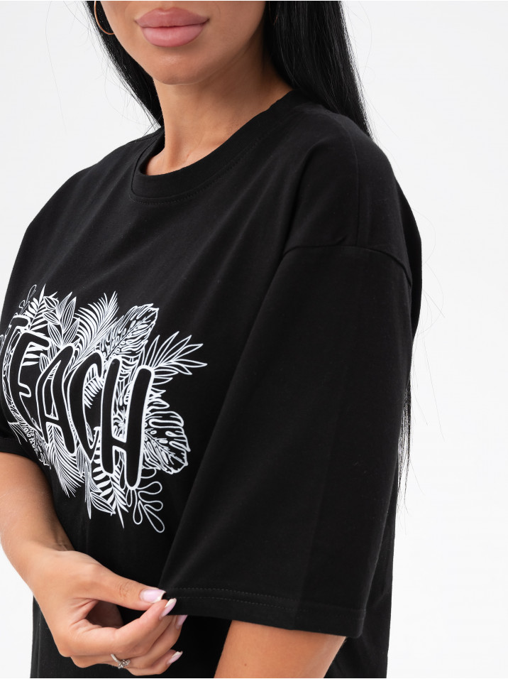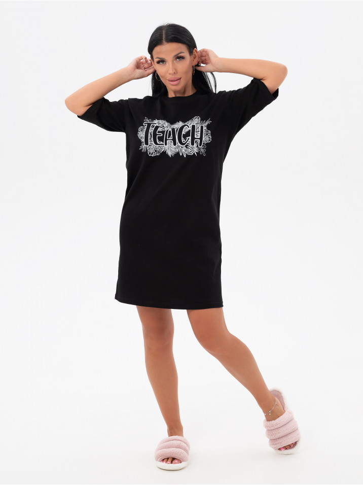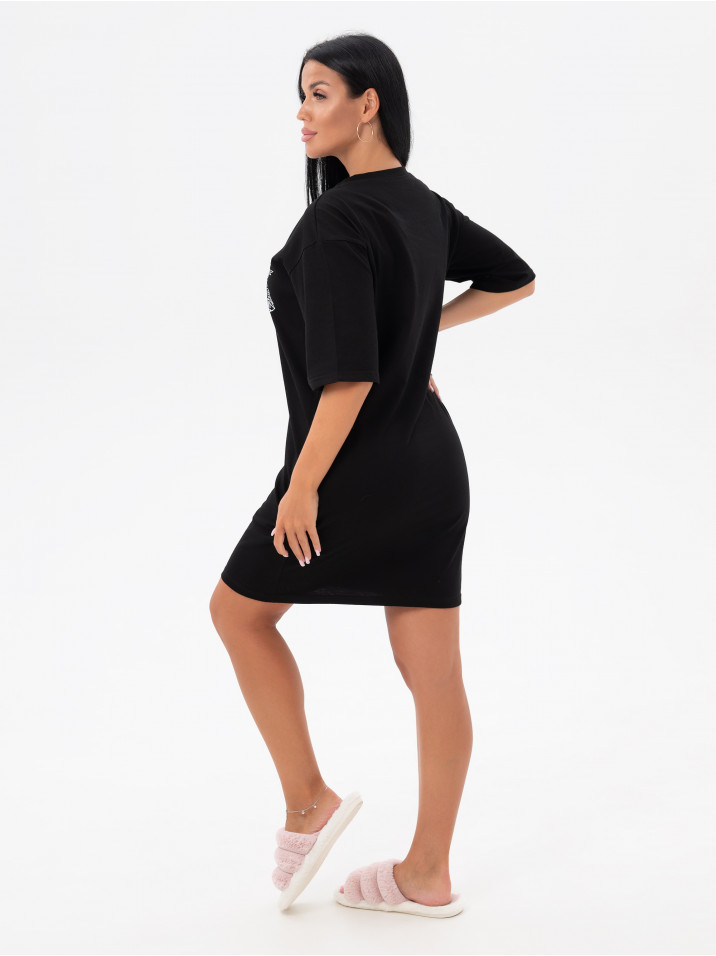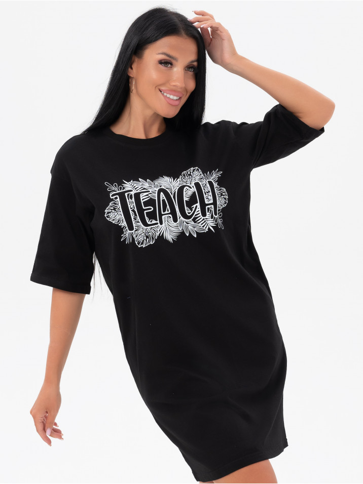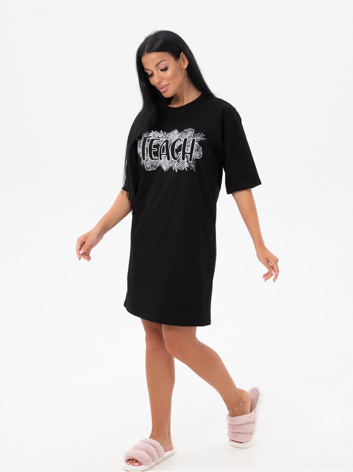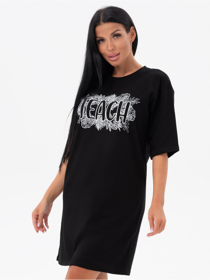 Состав: Кулирка/Хлопок 100%; Цвет: Черный Краткое описание Легкая повседневная туника  из тонкой трикотажной ткани. Комфортная и стильная домашняя одежда, в которой удобно заниматься повседневными делами, сохраняя женственность и очарование. Ткань дышащая и приятная к телу. Рисунок выполнен по современной технологии - не осыпается и не трескается, не чувствуется на ткани и позволяет коже под ним дышать. Свободное домашнее платье с рисунком имеет широкий размерный ряд для полных женщин с пышными аппетитными формами, для беременных и кормящих мам. Туника идеально для отдыха и дачи, возьмите с собой на море или наденьте на пляж, такое платье везде уместно, отличный подарок для мамы, жены, бабушки сестры или подруги на любой праздник и без повода