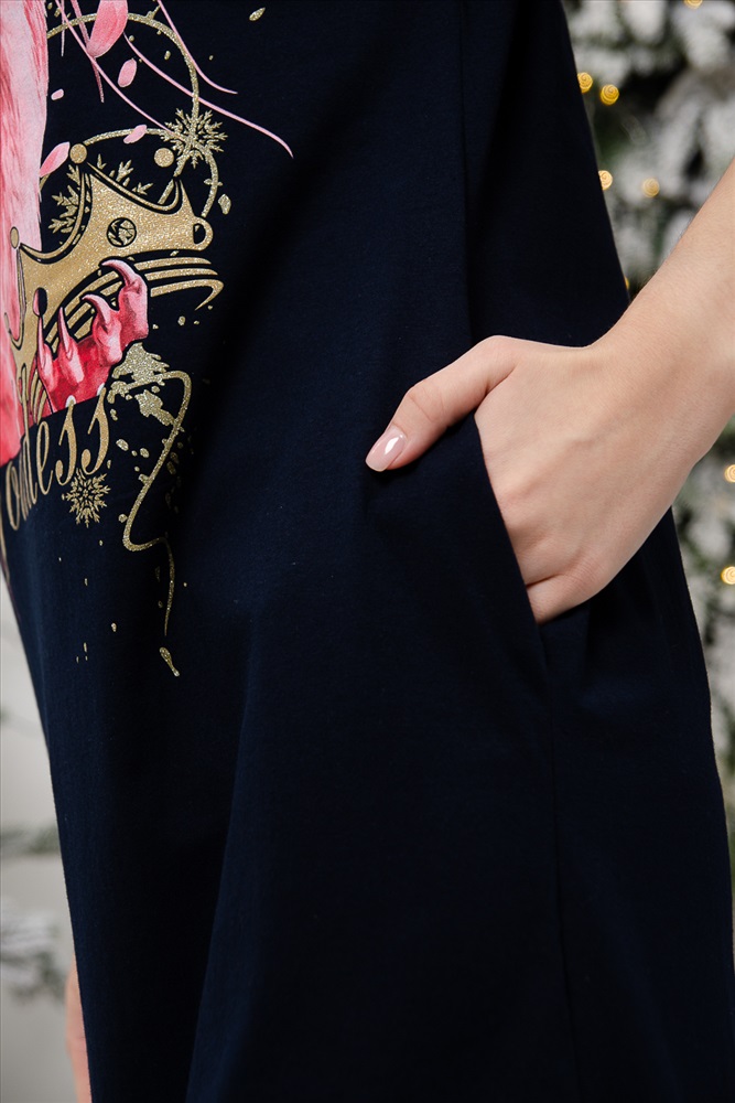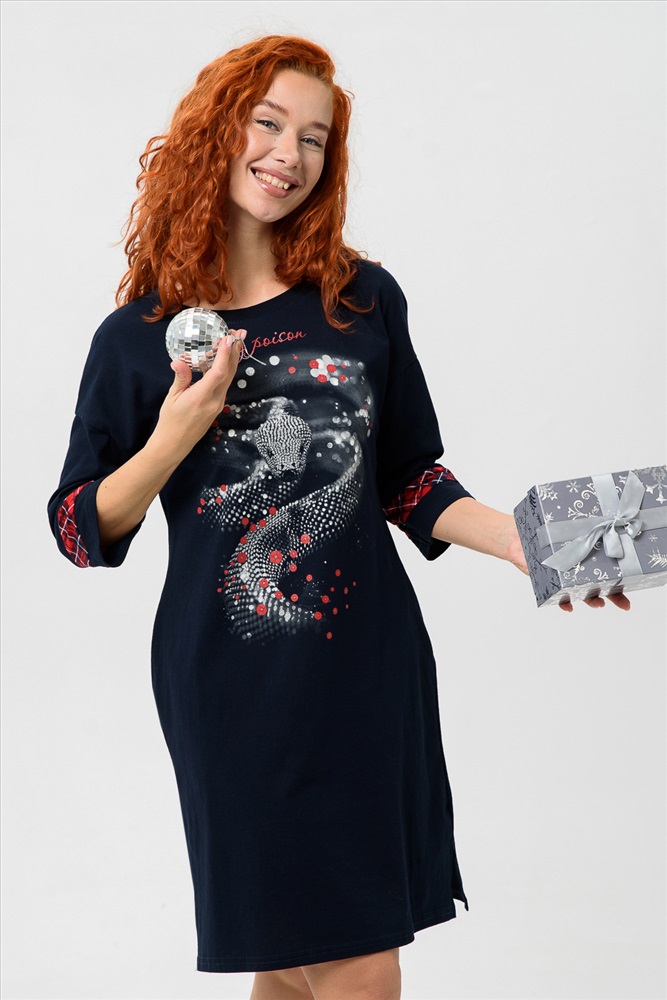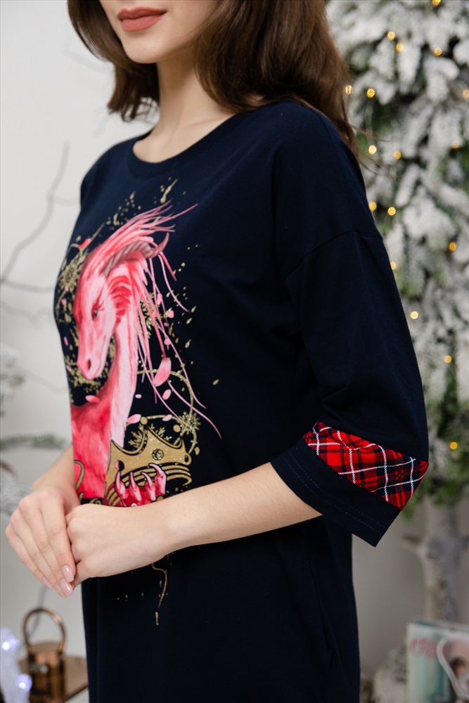 Туника прямого силуэта, длиной выше колена, с округлой горловиной, с карманами в боковых швах. Рукав длиной 3/4. С разрезами в нижней части боковых швов. Горловина обработана обтачкой из основного полотна.