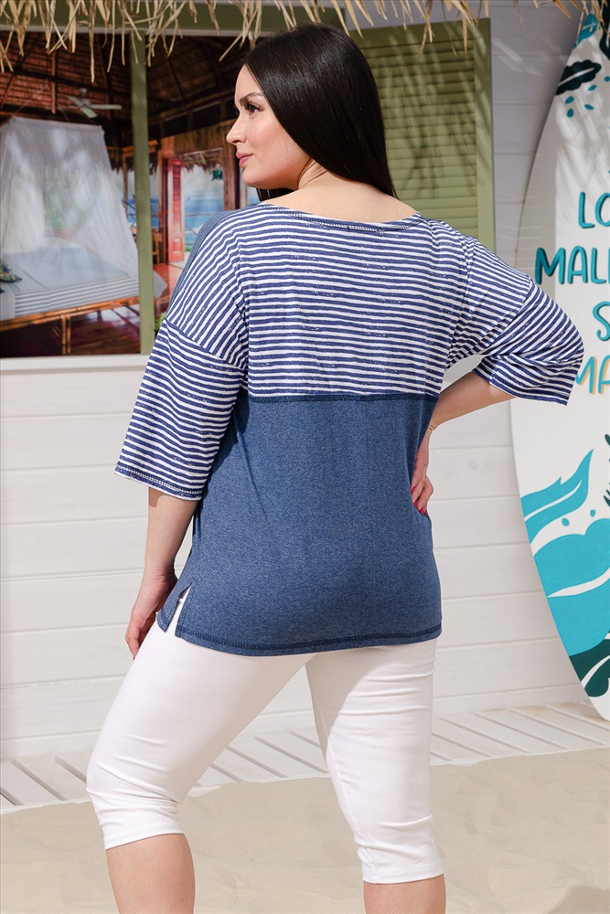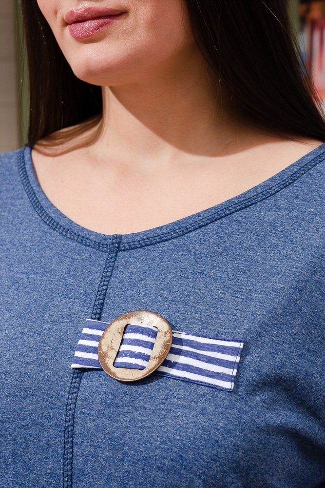 Туника женская прямого силуэта выполнена из меланжевой х/б ткани и ткани в полоску. Горловина округлая. Рукав цельнокроеный со швом. Полочка из двух симметричных деталей. В шов стачивания деталей вставлена пата с большой декоративной, кокосовой пуговицей. На спинке кокетка. Отдельно изготовленный карман настрочен на полочку.