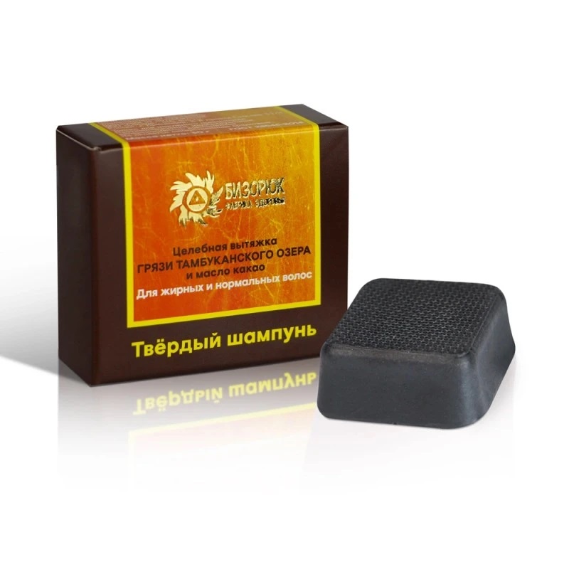 Твёрдый шампунь «Тамбуканская грязь и масло какао» для жирных и нормальных волос и чувствительной кожи головы. Обладает противовоспалительным действием.
