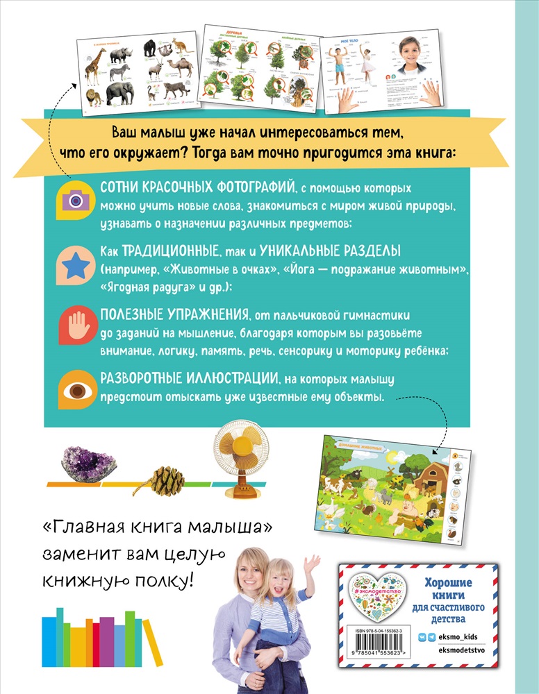 Эта книга не оставит равнодушными ни детей, ни взрослых — она очень красочная и познавательная! Фотообъекты чётко структурированы, начиная с игрушек малыша и заканчивая Солнечной системой. Также мы включили в издание такие интересные главы, как «Йога — подражание животным», «Рекордсмены мира фауны», «Животные в очках», и большие разворотные иллюстрации. _x000D_