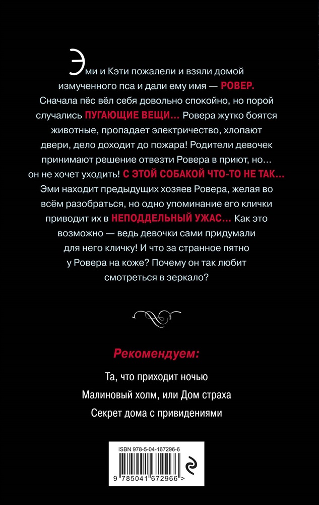 Сначала пёс вёл себя довольно спокойно, но порой случались ПУГАЮЩИЕ ВЕЩИ… Ровера жутко боятся животные, пропадает электричество, хлопают двери, дело доходит до пожара! Родители девочек принимают решение отвезти Ровера в приют, но… он не хочет уходить! С ЭТОЙ СОБАКОЙ ЧТО-ТО НЕ ТАК… Эми находит предыдущих хозяев Ровера, желая во всём разобраться, но одно упоминание его клички приводит их в НЕПОДДЕЛЬНЫЙ УЖАС… Как это возможно — ведь девочки сами придумали для него кличку! И что за странное пятно у Ровера на коже? Почему он так любит смотреться в зеркало?