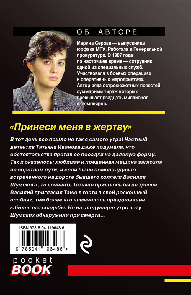В новом остросюжетном романе Марины Серовой «Принеси меня в жертву» частный детектив Татьяна Иванова оказывается впутанной в клубок семейных тайн бывшего коллеги Василия Шумского. Казалось бы, с женой Еленой у него любовь и взаимопонимание, но после юбилея свадьбы их обоих находят при смерти…_x000D_