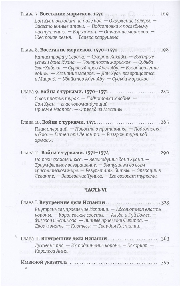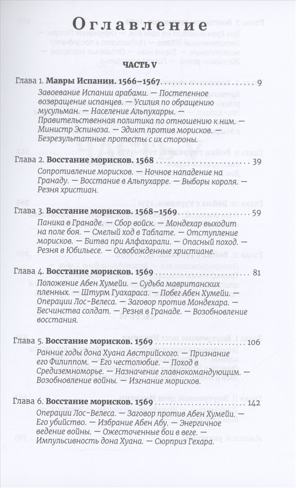 В пятой книге «Истории правления Филиппа II» описывается война с морисками с 1566 по 1571 год, а также война с турками с 1570 по 1574 год. Успехи христианской коалиции в войне против Оттоманской империи, победа в битве при Лепанто нанесли сильный удар по могуществу турок и оказали влияние на всю дальнейшую историю Европы, как, впрочем, и России.