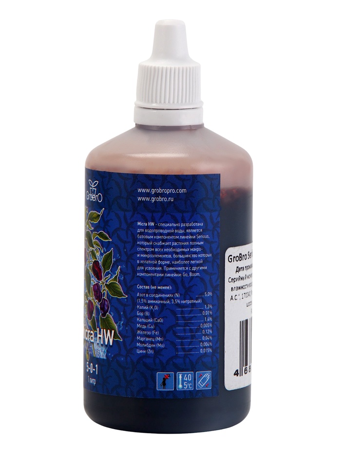 С удобрением GroBro Serious Micra HW ваш урожай станет предметом гордости! Эффективное, экономичное и надежное решение для гидропоники, которое гарантирует здоровый рост растений и высокую урожайность. Забудьте о сложностях и наслаждайтесь результатом – легкость в применении и видимый эффект уже после первых применений. Делайте выбор в пользу качества и удобства – начните выращивать с удовольствием и уверенностью!