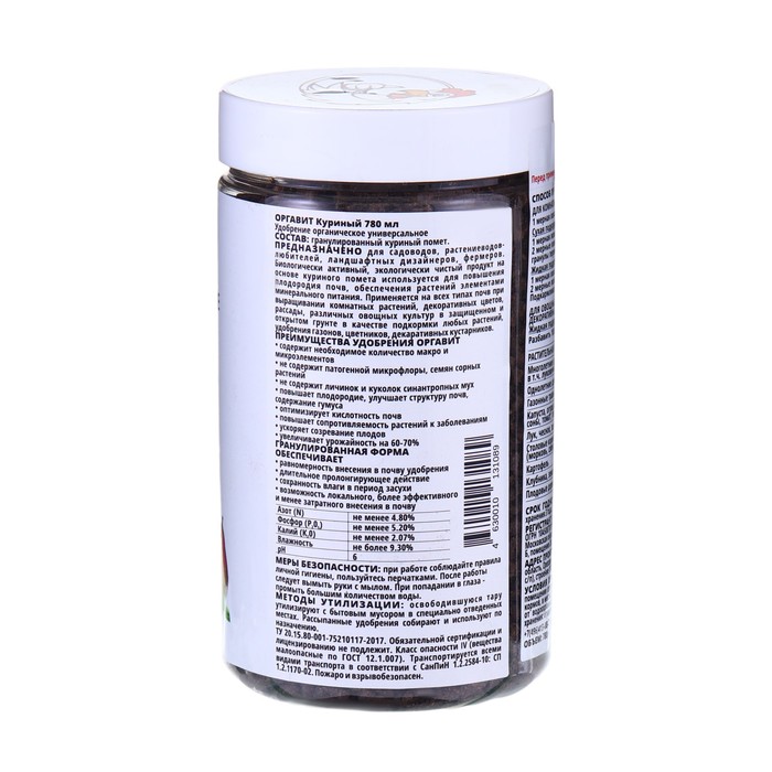 Состав удобрения Оргавит Куриный включает в себя органические компоненты, такие как перегной куриного помёта, который обогащен ценными микроэлементами, аминокислотами, витаминами и другими питательными веществами. Эти компоненты способствуют улучшению структуры почвы, повышению ее фертильности и активации жизненной активности почвенных микроорганизмов, что благоприятно сказывается на здоровье растений и урожайности.