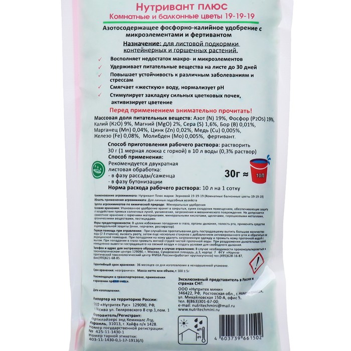 Удобрение «Нутривант Плюс» 19-19-19 Комнатные, балконные цветы, профессиональное,100 г