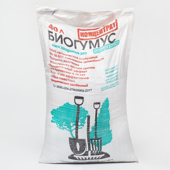 Производитель: ECOLOGICA; Габариты: 60 x 45 x 12; Доставка: Платная; Страна: Россия; В боксе: 1 шт; Состав: См. на упаковке; Материалы: см. на упаковке; Фасовка: по 1 шт; Индивидуальная упаковка: Мешок; Сертификат: Не подлежит сертификации; Область применения: Универсальные; Происхождение: Органические (природное); Препаративная форма: Концентрат; Вид: Удобрения; Состав (действующее вещество): Азот, Фосфор, Калий; Периоды применения: Осень, Лето, Весна; Комплексные удобрения: Да; Класс опасности: 3 класс (умеренно опасные); Группы элементов: Макроудобрения; Эффект: Увеличение урожая; Вид выращиваемой культуры: Универсальный; Вес/Объём: 40 л; Фиксированная цена: Да Биогумус - эффективное органическое удобрение, вырабатываемое червями из навоза. Обладает сбалансированным составом, оптимальным для любых растений. Основными его компонентами являются: гумус (приблизительно 40%) азот (3%) калий (1,2%) кальций (5%) магний (5%) фосфор (5%) В небольших концентрациях присутствуют также бор, марганец, медь, цинк и др. Эти вещества имеют способность помогать растениям превращать минеральные соединения в аминокислоты. Благодаря такой особенности в урожае не содержатся вредные тяжелые металлы и нитраты. Может использоваться как самостоятельный грунт. Повышает урожайность на 30-50%. При использовании Биогумуса мы даем гарантию получения экологически чистого урожая. Биогумус совершенно безвреден на любых почвах. Положительный эффект от него может наблюдаться до 5 лет.