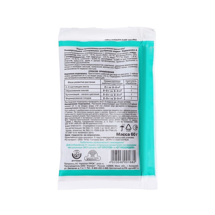 Производитель: Садовая аптека; Габариты: 12 x 9 x 1; Страна: Россия; В боксе: 120 шт; Состав: См. на упаковке; Материалы: см. на упаковке; Фасовка: по 1 шт; Индивидуальная упаковка: Без упаковки; Сертификат: СТР; Область применения: Для овощей; Происхождение: Минеральные (неорганические); Препаративная форма: Порошок; Вид: Удобрения; Состав (действующее вещество): Калий; Периоды применения: Весна, Осень; Комплексные удобрения: Да; Класс опасности: 3 класс (умеренно опасные); Группы элементов: Макроудобрения; Эффект: Увеличение урожая; Вид выращиваемой культуры: Огурец