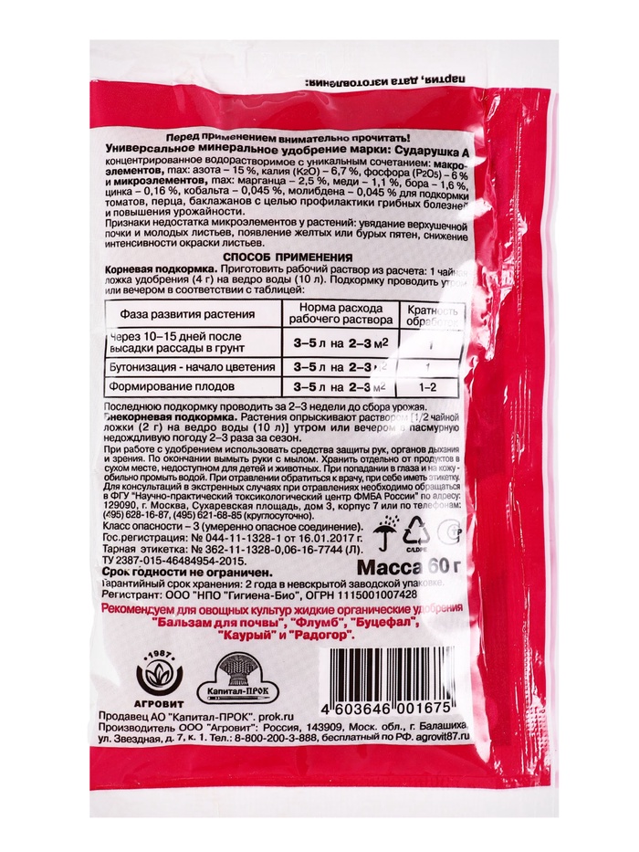 Макроэлементы: азота – 15%, фосфора (Р2О5) – 6,0%, калия (К2О) – 6,7%.