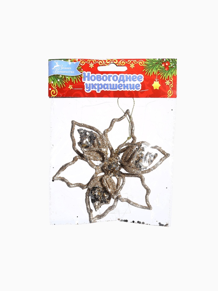 Новогоднее украшение в виде золотистого цветка с резным узором привнесёт в интерьер нотки классики и изящества. Пластиковая основа обеспечивает лёгкость и прочность, а стилистика, сочетающая барокко и ар-деко, добавляет праздничной торжественности и утончённости.