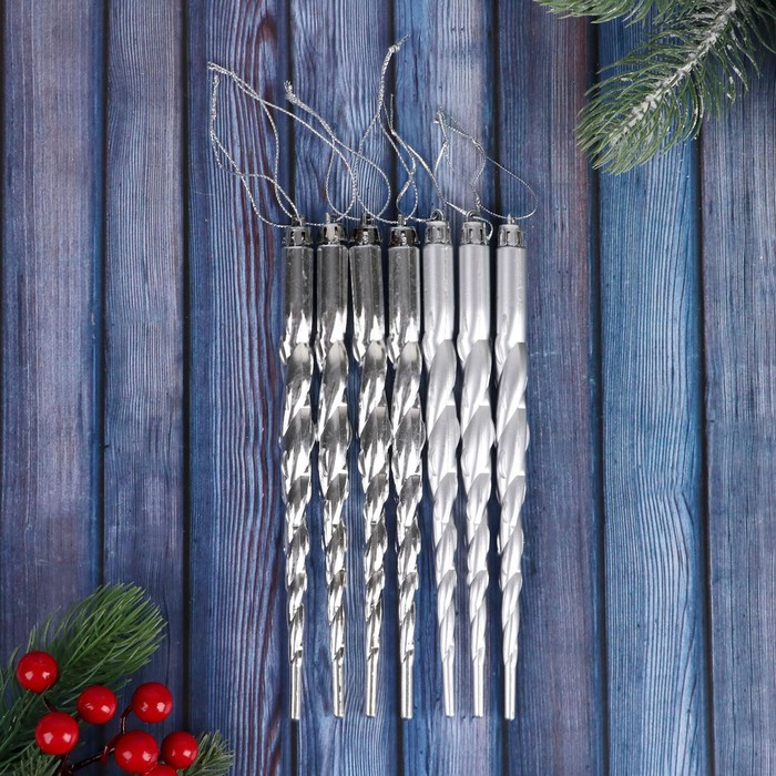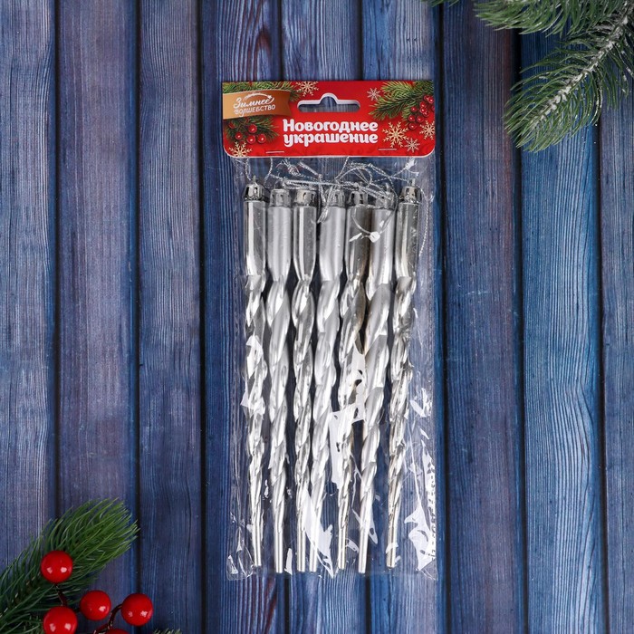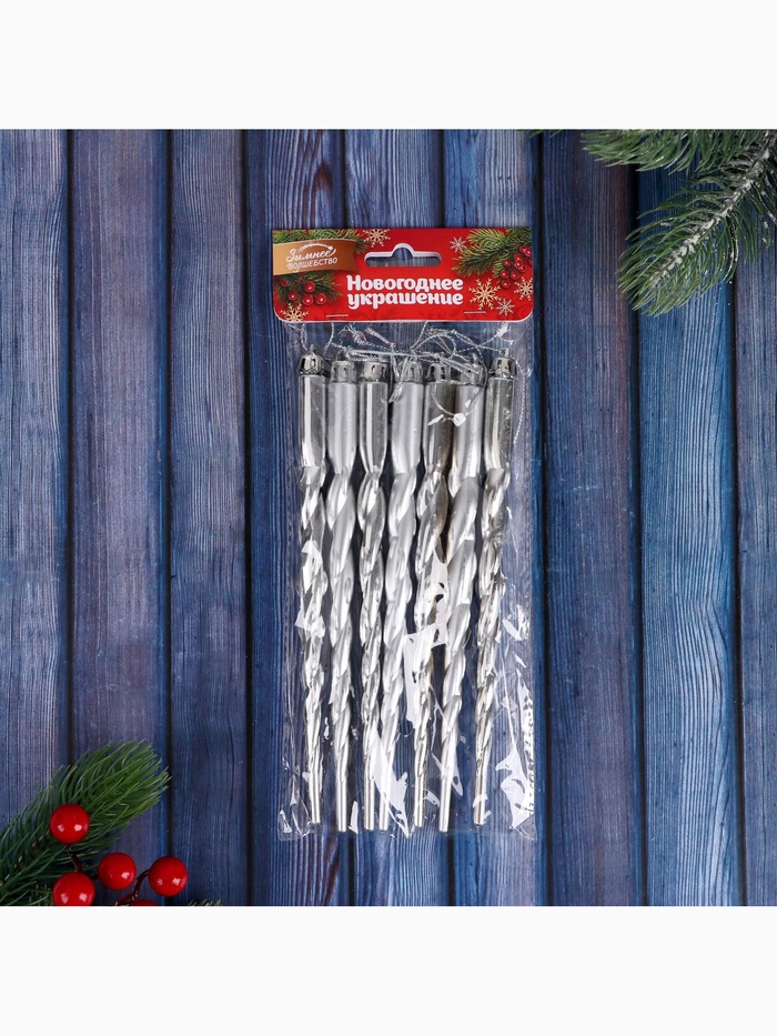 Праздник на высоте: Эти игрушки становятся частью семейных традиций. Их можно комбинировать с другими украшениями, создавая контраст между классикой и индустриальным стилем. Серебро не теряет актуальности годами, а вытянутая форма добавляет ощущение движения, как настоящие сосульки на ветвях деревьев. Набор идеален для оформления дома, офиса или подарочных коробок. КомплектацияНабор - 7 штук. Комментарии к товару