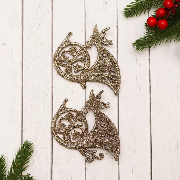 Набор из двух золотистых ёлочных украшений в форме музыкальных труб с резным узором привнесёт в новогодний декор нотки классики и барокко. Компактный размер 9×10 см делает их удобными для размещения на ветках любой ёлки, добавляя праздничного блеска и изящества.