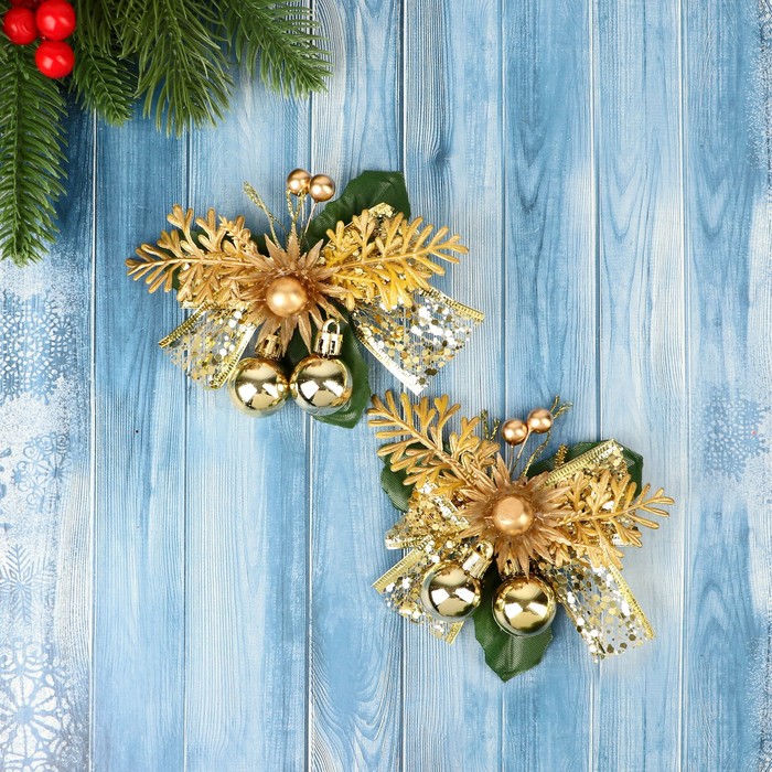 Создайте зимнюю сказку – золотые банты с наполнением в стиле классики и новогоднего барокко! Золотые новогодние банты – набор из 2 игрушек, сочетающих строгость классики и пышность барокко. Их размер – 12×11 см, что делает акцент заметным, но не перегружает композицию.