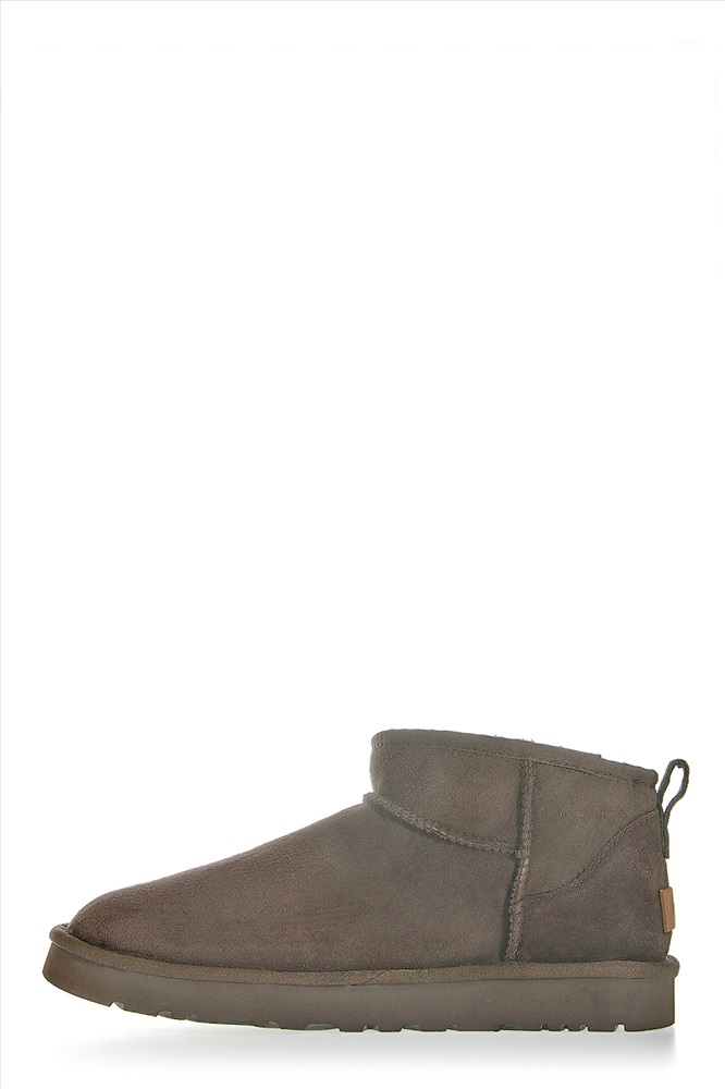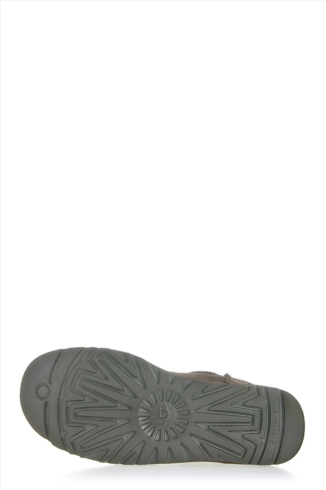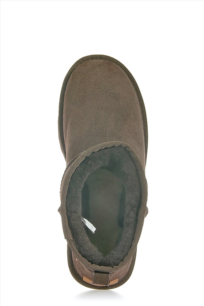 Унты выполнены из натуральной замши, верх оформлен объемными швами. Задник укреплен вставкой и дополнен логотипом бренда. Внутренняя отделка из натуральной шерсти.