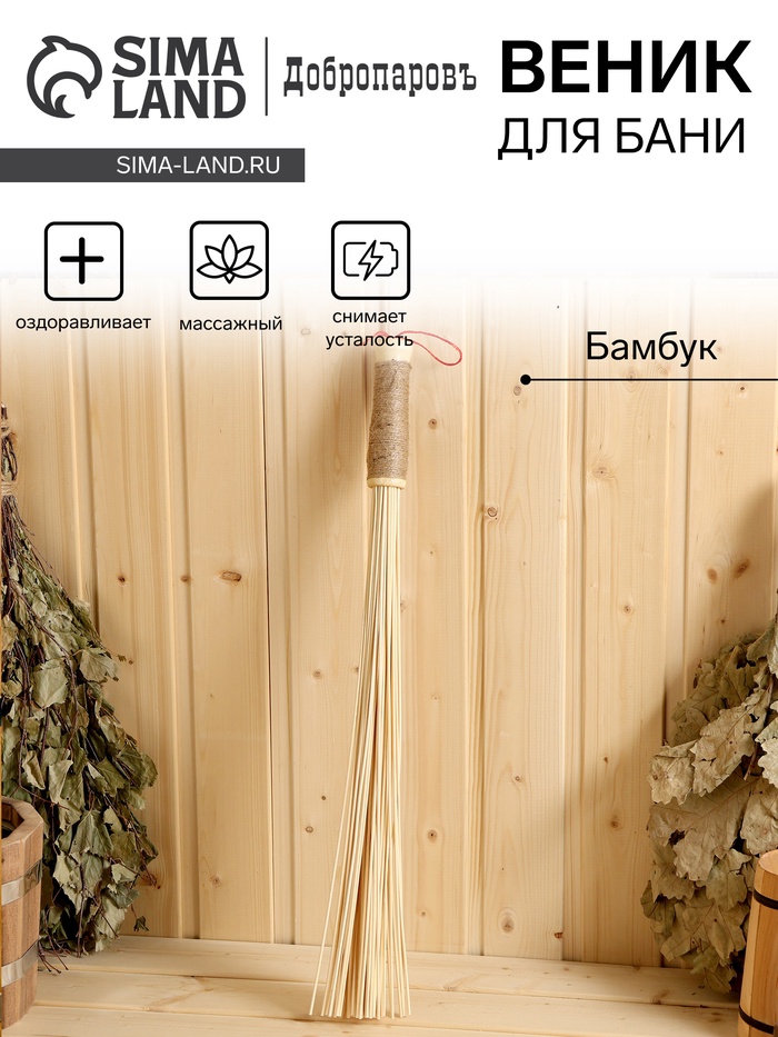 Веник массажный из бамбука для бани, 60 см, 0,2 см прут, джутовая ручка