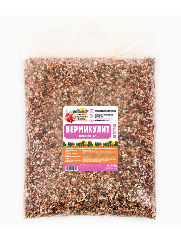 Это идеальный помощник для садоводов и цветоводов, стремящихся создать оптимальные условия для роста своих растений. Фракция 3-5 мм обеспечивает отличную воздухопроницаемость и дренаж, что особенно важно для здоровья корневой системы. Используйте вермикулит при посадке растений, добавляя его в грунт для улучшения его свойств. Он также отлично подходит для мульчирования, что помогает сохранить влагу и защитить растения от перепадов температуры.