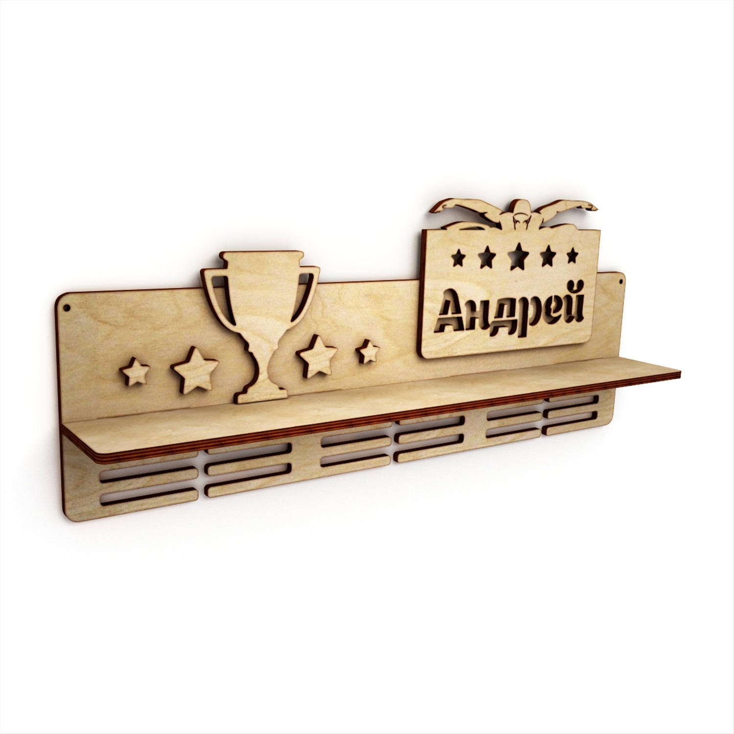 Вешалка для медалей с именной табличкой и полочкой Андрей пловец