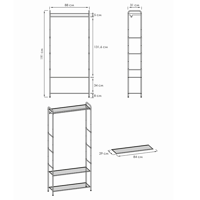 * Способы использования системы хранения: гардеробная напольная вешалка, стеллаж для хранения, подставка для цветов, витрина для магазинов