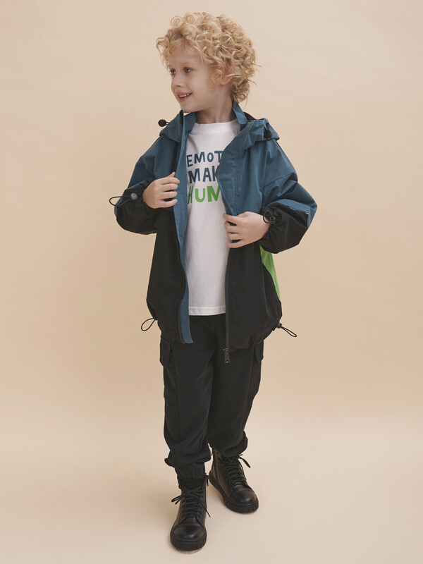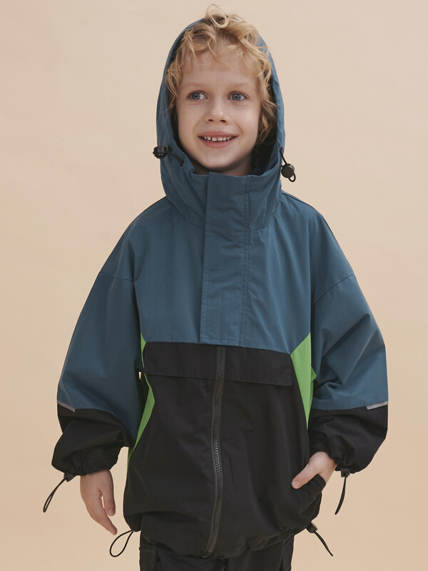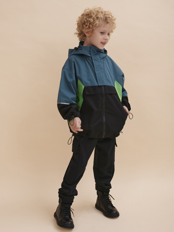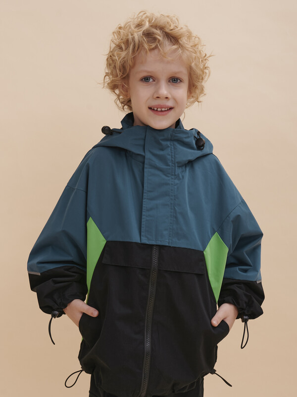 Укороченная ветровка с цельнокроеным рукавом для мальчиков. Стиль куртке придают разноцветные резные вставки - тренд сезона Весна 23. Модель свободного современного кроя, увеличенного объема и c цельнокроеным рукавом. Наличие в составе ткани мембраны делает куртку максимально комфортной при носке. РЕКОМЕНДУЕМЫЙ ТЕМПЕРАТУРНЫЙ РЕЖИМ не ниже +10°С. Водоотталкивающая пропитка (DWR) наносится на внешнюю поверхность ткани и задерживает грязь и влагу снаружи. Дополнительный слой на внутренней стороне ткани не позволяет ребенку промокнуть. Хлопковый трикотаж в капюшоне и по стану - хорошая воздухопроницаемость, ребенок не вспотеет, в рукавах подклад из полиэстера - для удобства надевания. Капюшон двухшовный - хорошо сидит на голове, неотстегивающийся. Регулировка объема капюшона, низа рукавов и куртки, а также внутренняя ветрозащитная планка и наружная на липе - дополнительное тепло. Центральная застежка: тракторная молния. Не заедает! Тканевый стоппер защищает подбородок от зажима молнией. Фиксирующая строчка предо