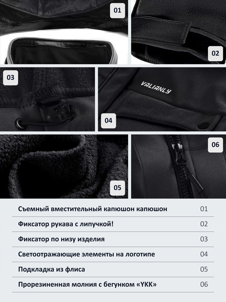 Производитель: VALIANLY; Артикул: 9566Ch; Бренд: VALIANLY; Пол: Женский; Сезон: Осень весна; Страна производителя: Китай; Тип: Ветровки; Цвет: Черный; Рост: от 155 до 195; Диапазон температур: от 0° до + 15°; Водонепроницаемость: 10 000 мм; Комплектация: Ветровка/Капюшон; Состав: 95% Полиэстер 5% Спандекс; Материал: Softshell, Мембранные материалы, Полиэстер, Тефлон; Материал подкладки: 100% Полиэстер/флис; Материал подкладки воротника: 100% Полиэстер/флис; Фактура материала: плотная; Бренд фурнитуры: YKK*; Покрой: Полуприлегающий/Свободный; Длина одежды: до бедра; Тип рукава: Длинный; Внутренние карманы: Нет; Тип кармана: Прорезной на молнии; Воротник: стояче-отложной; Фиксаторы: На капюшоне/по низу/на рукавах; Опции капюшона: Съемный; Декоративные элементы: Хлястик, Светоотражающие элементы, Капюшон, Карманы; Внутренние швы: Прошиты; Вид застежки: Молния, Кнопки, Клапан; Особенности модели: family look, ветрозащита, водоотталкивающий материал, гипоаллергенный материал, с начесом, утягивающая модель; Вид одежды: Свободная, утепленная модель; Стиль: Повседневный, Спортивный; Рисунок: Однотонный, Логотип, Надписи; Коллекция: Весна-Лето 2025; Тренд: уличная мода; Тип упаковки: Пакет; Цвета: бирюзовый, черный, розовый, малиновый, горчичный, синий; Габариты (ДхШхВ): 56 x 38 x 5 см; Вес: 1 кг