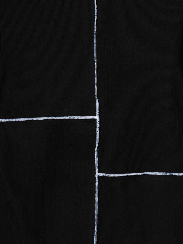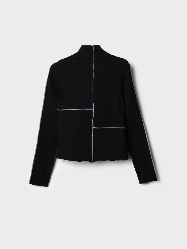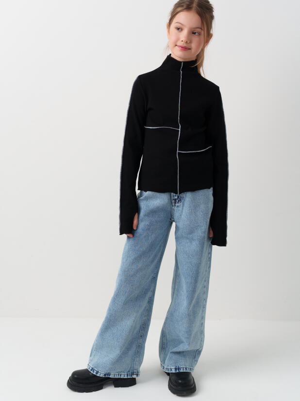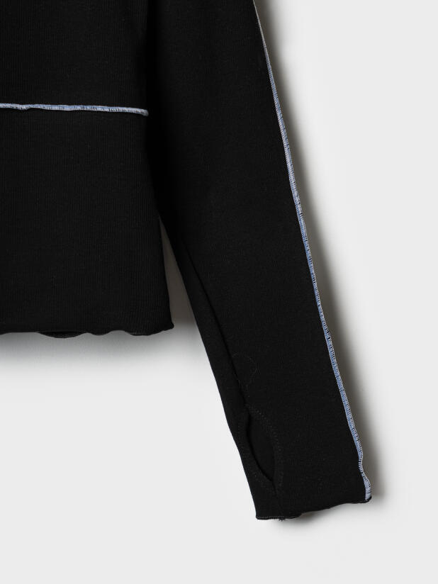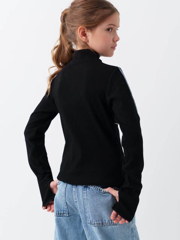 Водолазка для девочки подростка. Выполнена из эластичного трикотажа в рубчик. Имеет высокий воротник-стойку и длинные рукава с удобными прорезями для большого пальца. По линии переда, рукавов и боков проходят выразительные швы с белой отделочной строчкой, создавая стильный контраст на чёрном фоне.