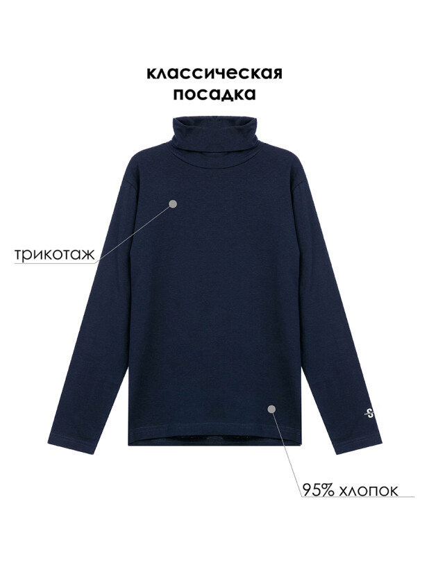 Эта классическая подростковая водолазка для школы выполнена из приятного к телу трикотажа, который хорошо удерживает тепло и при этом позволяет коже дышать. Материал гипоаллергенный, мягкий и эластичный — идеально подходит для чувствительной детской кожи. Даже после частых стирок эта универсальная синяя водолазка для мальчиков остаётся аккуратной и не деформируется.
