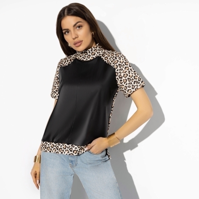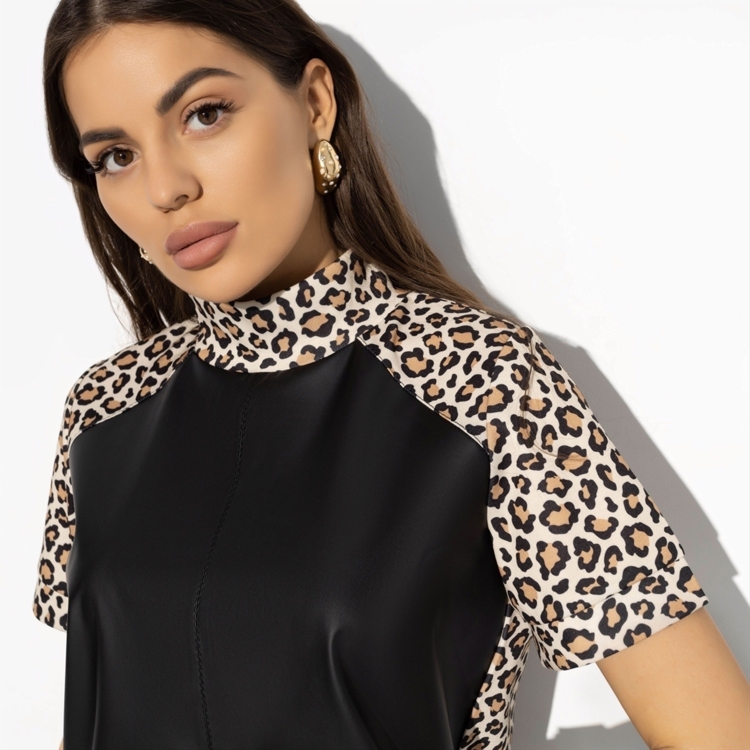 ТН ВЭД: 6110309900; Состав: Трикотаж «милано», «экокожа» (65% п/э, 30% вискоза, 5% стрейч); Плотность ткани: Средняя; Тип ткани: Трикотаж, текстиль; Вид застежки: Нет; Дополнительный цвет ткани: Бежевый; Карманы: Нет; Основной цвет ткани: Черный; Отрезная талия: Нет; Подклад: Нет; Резинка по талии: Нет; Рисунок/раппорт: Каждое изделие уникально из-за расположения рисунка на ткани; Сезон: Круглогодичный; Силуэт: Свободный; Стиль: Повседневный