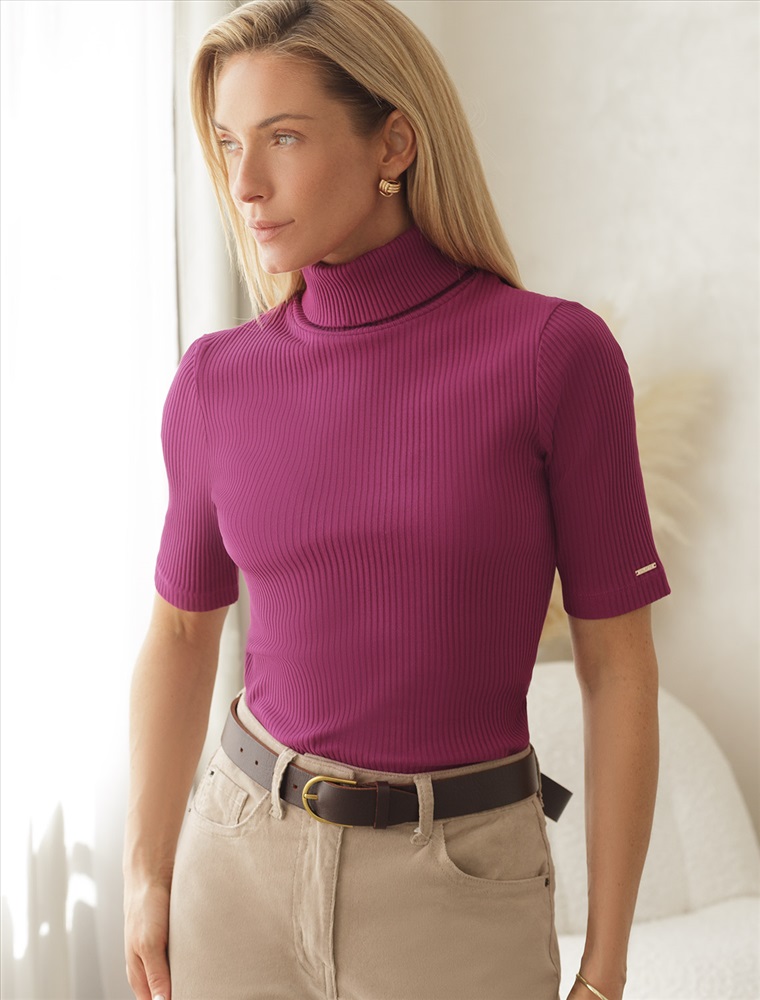 Водолазка с коротким рукавом выполнена из фактурного трикотажа в рубчик. Модель идеально сидит по фигуре не сковывая движения. Хлопковый трикотаж поддерживает оптимальную температуру тела, поэтому в изделии будет комфортно в течении всего дня. Наличие эластана в составе гарантирует формоустойчивости. Водолазка отлично впишется в деловой дресс-код и подойдет для повседневного аутфита.