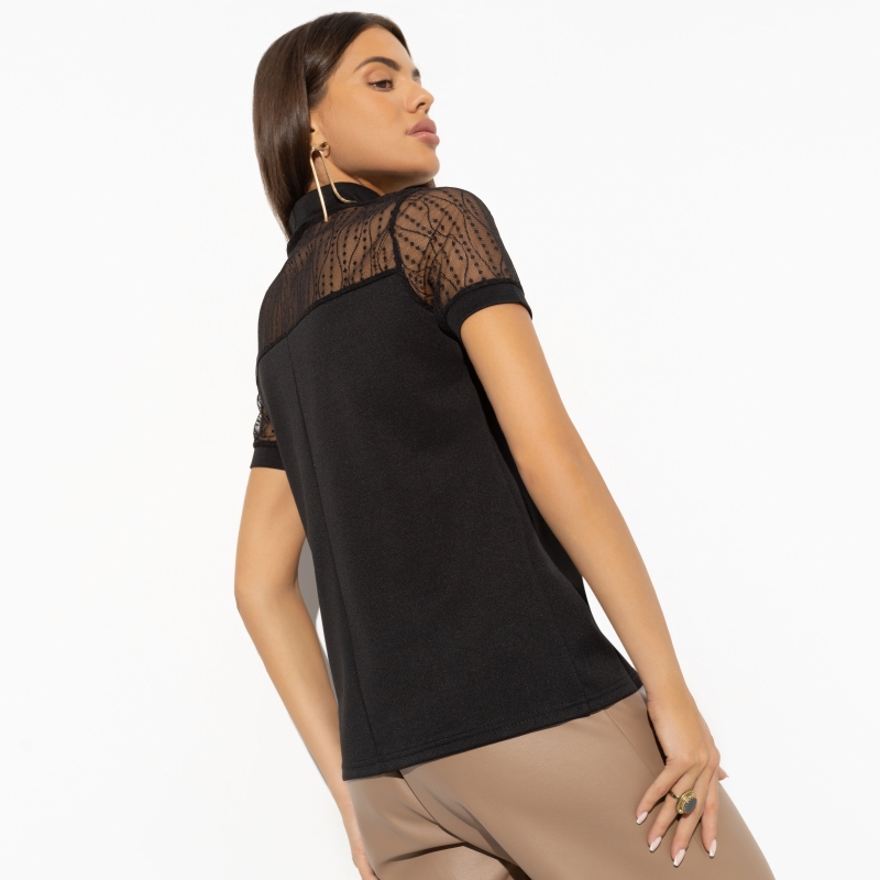 ТН ВЭД: 6110309900; Состав: Трикотаж «милано», кружево (65% п/э, 30% вискоза, 5% стрейч); Плотность ткани: Средняя; Тип ткани: Трикотаж; Вид застежки: Нет; Карманы: Нет; Основной цвет ткани: Черный; Отрезная талия: Нет; Подклад: Нет; Резинка по талии: Нет; Сезон: Круглогодичный; Силуэт: Прямой; Стиль: Повседневный