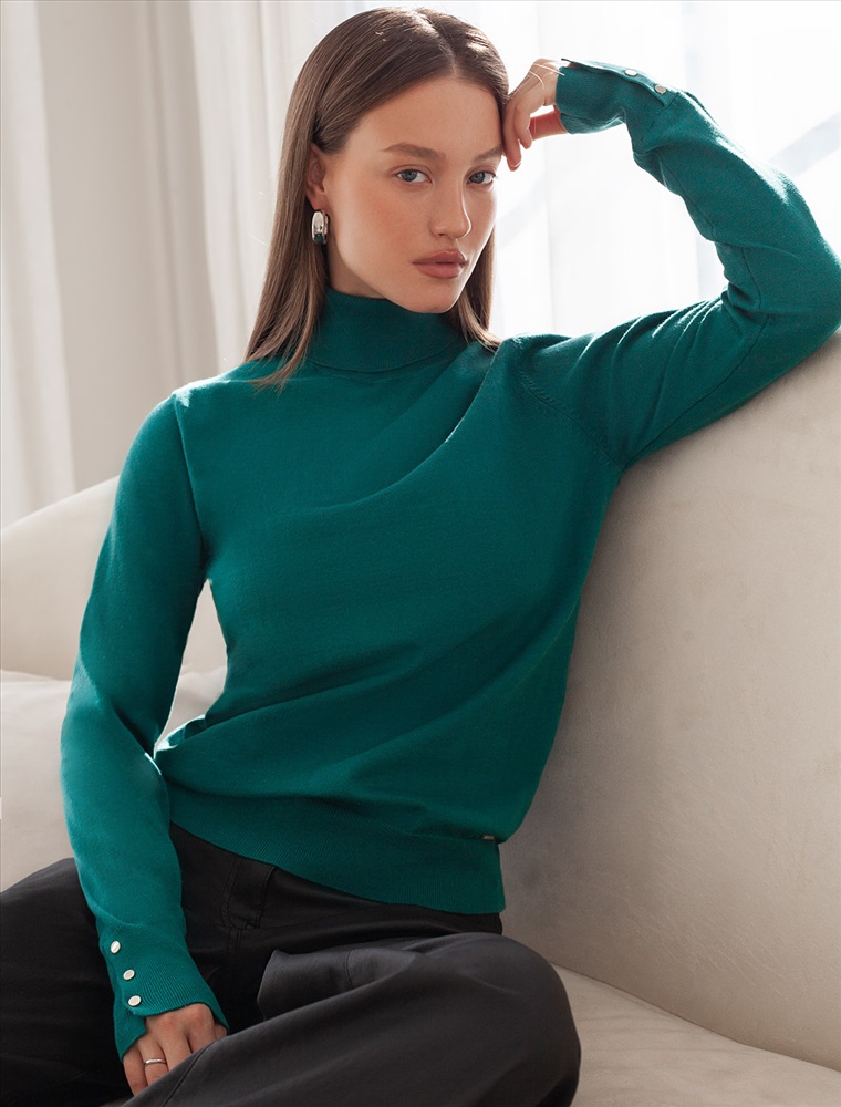 Водолазка тонкой вязки выполнена из хлопка. Лаконичная модель дополнена манжетами с золотистыми пуговицами. Изделие не сковывает движений и подходит для любой фигуры. Мягкая пряжа очень приятная к телу не колется и сохраняет тепло при этом не перегревая.
