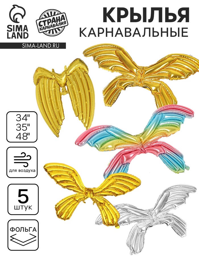 Фольгированные крылья — это яркий декоративный элемент для тематических мероприятий, костюмов и фотосессий. В наборе 5 крыльев разных размеров (34, 35 и 48 дюймов), выполненных в белом, золотистом и разноцветном цветах. Эти крылья легко надуваются воздухом благодаря специальному клапану, поэтому они удобны и долговечны в использовании.