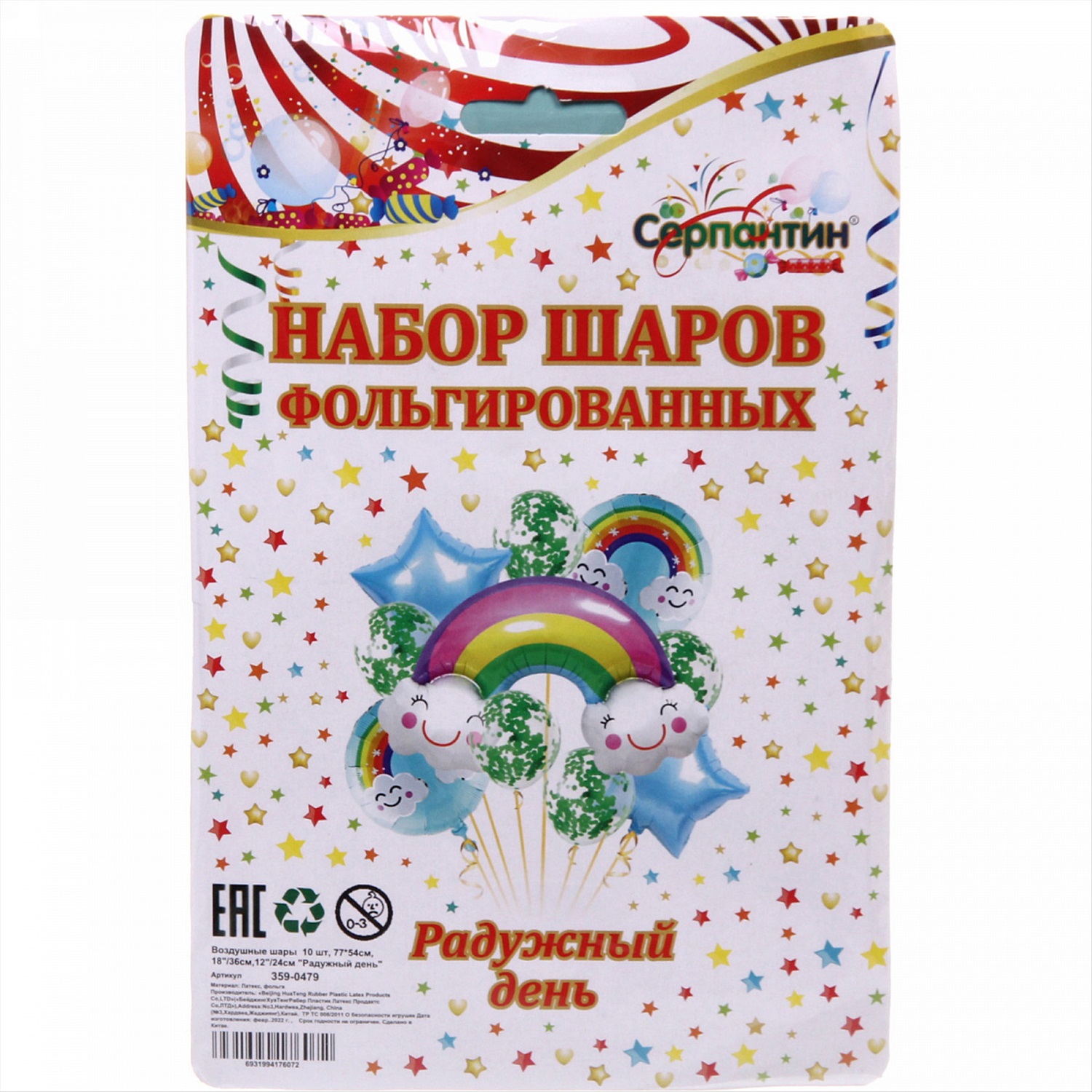 Бренд: Серпантин; Индивидуальная упаковка: Пакет с вкладышем; Материал: Латекс, фольга; ШтрихКод: 6931994176072; Страна происхождения: Китай; Количество в коробке: 500; Количество предметов в наборе: 10; Цвет: В ассортименте; Вид: Букет шаров; Тематика: Детство; Рисунок: Нет