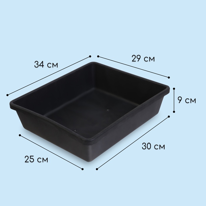 Габариты: 35 x 29,2 x 9,3; Доставка: Платная; Страна: Россия; В боксе: 20 шт; Состав: Пластик; Материалы: пластик; Фасовка: по 1 шт; Индивидуальная упаковка: Без упаковки; Сертификат: Не подлежит сертификации; Цвет: Чёрный; Длина, см: 35; Ширина, см: 30; Высота, см: 9; Объём, л: 8; Дренажные отверстия: Нет