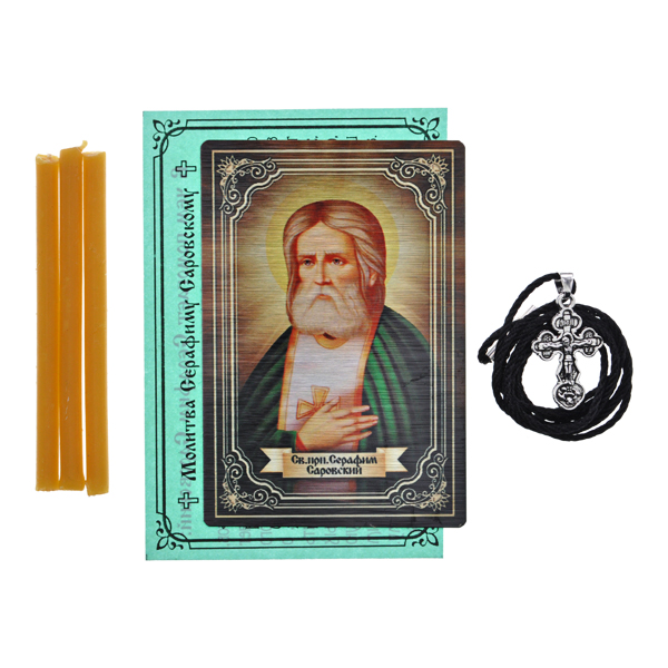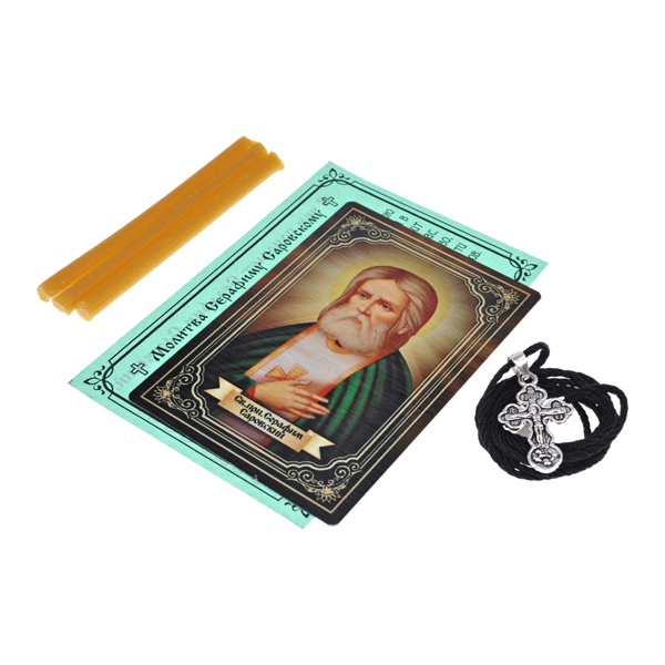 В составе набора металлическая иконка 58х86мм, молитва, 3 восковые свечи, крестик из бижутерного сплава с покрытием под серебро со шнурком. Набор упакован в прозрачный полипропиленовый пакет.