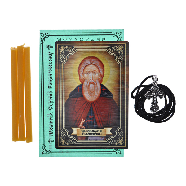 В составе набора металлическая иконка 58х86мм, молитва, 3 восковые свечи, крестик из бижутерного сплава с покрытием под серебро со шнурком. Набор упакован в прозрачный полипропиленовый пакет.