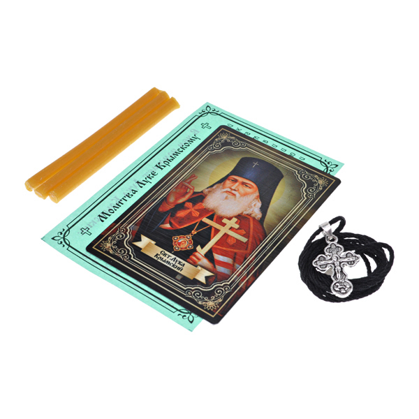 В составе набора металлическая иконка 58х86мм, молитва, 3 восковые свечи, крестик из бижутерного сплава с покрытием под серебро со шнурком. Набор упакован в прозрачный полипропиленовый пакет.