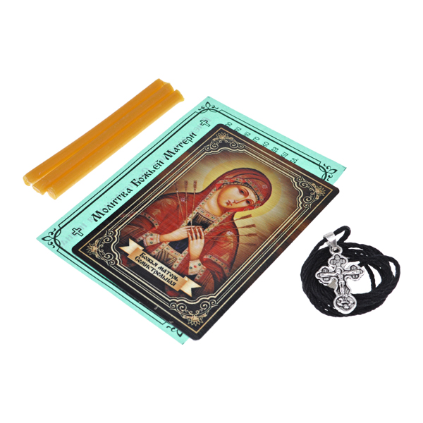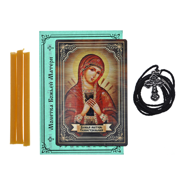 В составе набора металлическая иконка 58х86мм, молитва, 3 восковые свечи, крестик из бижутерного сплава с покрытием под серебро со шнурком. Набор упакован в прозрачный полипропиленовый пакет. В чем помогает Семистрельная икона Божьей Матери: - Дарует выздоровление, успокаивает душу, исцеляет тело, оберегает от травм; - Защищает от конфликтов с людьми: сослуживцами, соседями, и др.; - Смиряет человеческий гнев, раздражительность; - Помогает в смягчении сердец людей, враждебно настроенных; - Оберегает воинов и защитников; - Помогает помириться супругам, родственникам, близким людям. Компоненты набора не освящены. При необходимости это можно сделать в церкви либо самостоятельно, окропив святой водой.