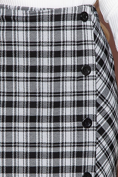 Юбка в клетку из жаккардового трикотажного полотна с имитацией застежки и шлицей по переду.