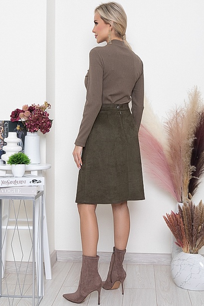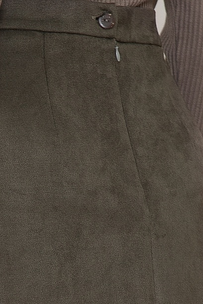 • Юбка трапеция из искусственной замши на притачном поясе и застежкой в среднем шве спинки на пуговицу и потайную молнию.