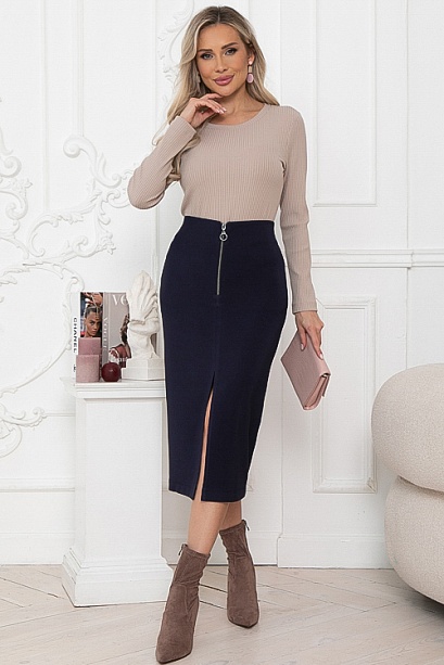 • Юбка из эластичного, плотного  хорошо держащего форму трикотажного полотна. По среднему шву переда функциональная молния и разрез.