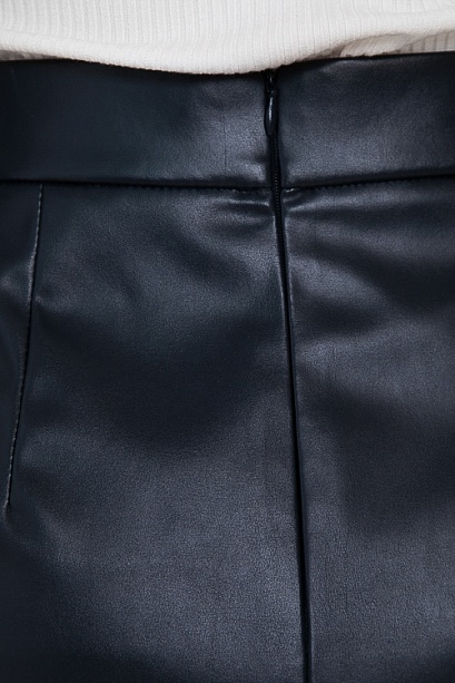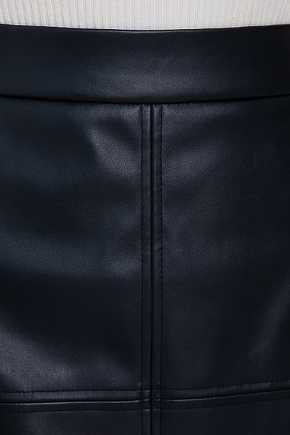 • Юбка трапецевидного силуэта из эко кожи с притачным поясом и застежка молния по спинке.
