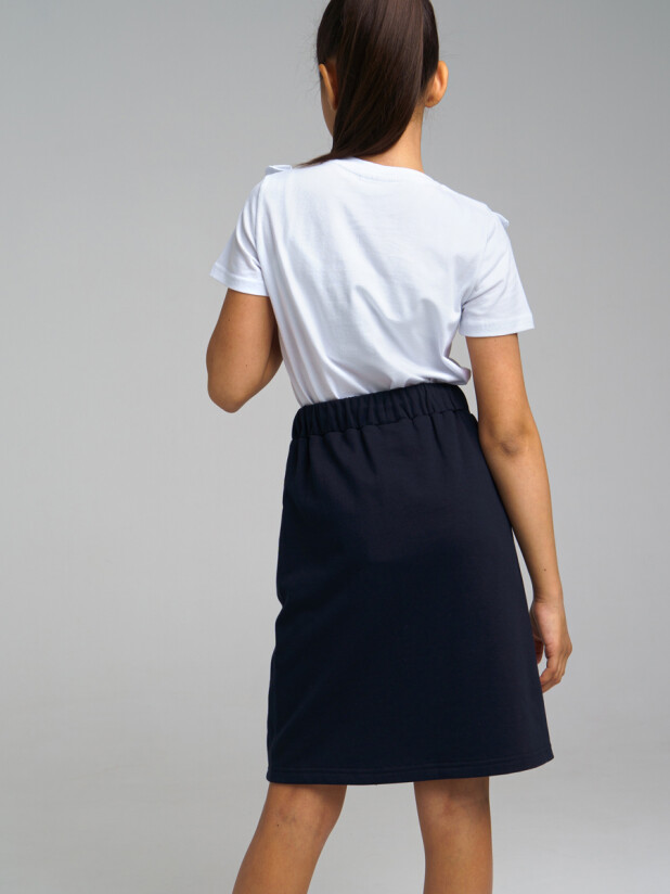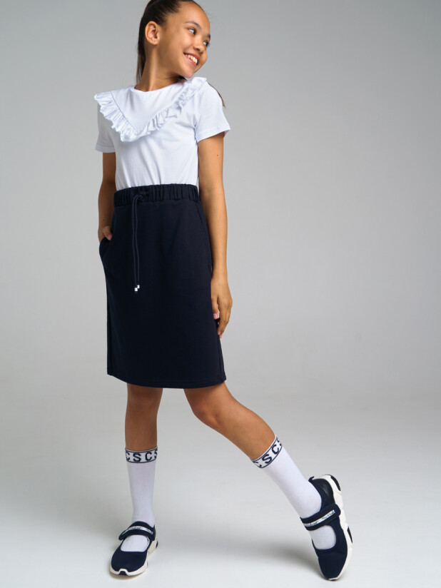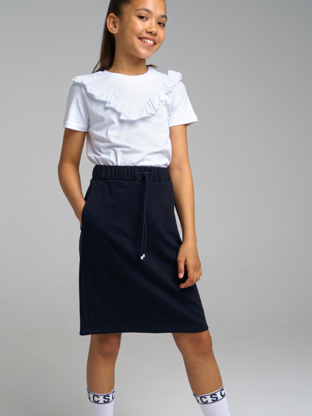 Классическая тёмно-синяя школьная трикотажная юбка прямого силуэта для девочки подростка от PlayToday — стильный и универсальный элемент школьного гардероба, сочетающий комфорт и аккуратность классической формы. Идеальный выбор для активных будней.