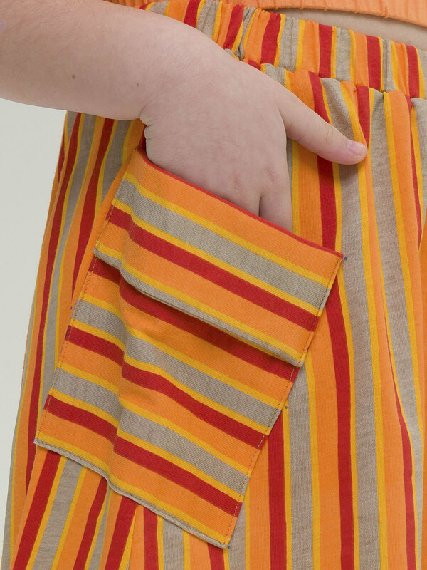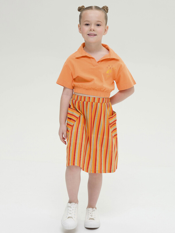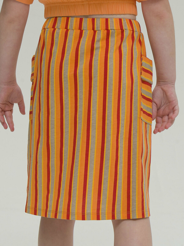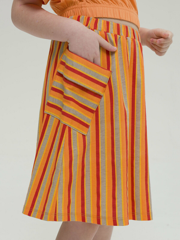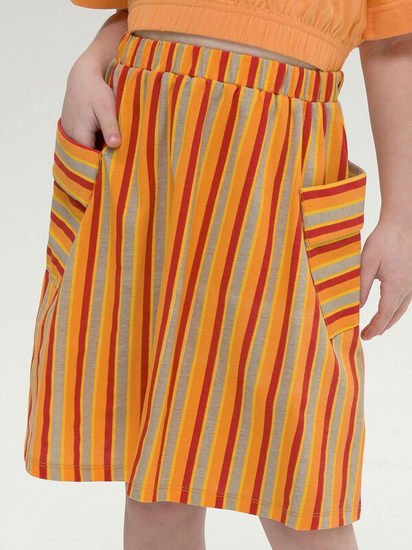 Модная трикотажная юбка для девочки на резинке - это практичный вариант на каждый день. Выполнена из воздушного хлопкового трикотажа принтованного в полоску - идеальна для жаркой погоды. Юбка, слегка расклешенная книзу, длиной до середины икры. По бокам два больших накладных наклонных кармана с клапанами привлекают внимание и делают юбку самой актуальной в этом сезоне. Широкая резинка не давит, не натирает - удобно и комфортно в течение всего дня. Легкая повседневная юбка займет достойное место в гардеробе девочки, подойдет как для ежедневной носки, так и для особых случаев.